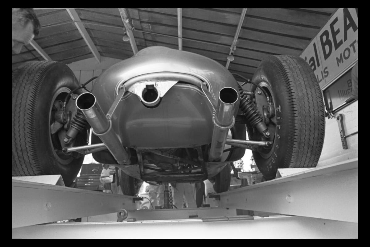 With sponsorship from Los Angeles-based Harvey Aluminum, Mickey Thompson took three cars to the 1962 Indianapolis 500. All were powered by Buick V-8 engines mounted in the rear -- an unconventional layout at the time. Only Dan Gurney, driving the #34 car, managed to qualify. Gurney was in ninth place when a leaking transaxle ended his race on lap 92.