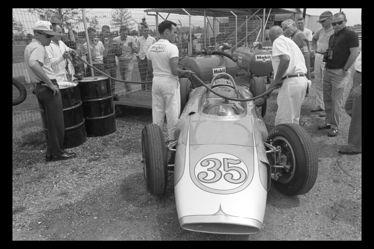 With sponsorship from Los Angeles-based Harvey Aluminum, Mickey Thompson took three cars to the 1962 Indianapolis 500. All were powered by Buick V-8 engines mounted in the rear -- an unconventional layout at the time. Only Dan Gurney, driving the #34 car, managed to qualify. Gurney was in ninth place when a leaking transaxle ended his race on lap 92.
