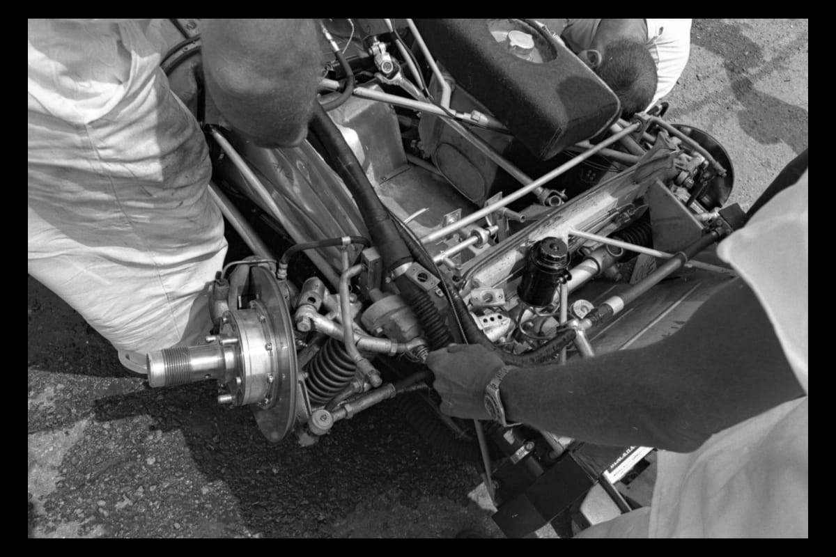 With sponsorship from Los Angeles-based Harvey Aluminum, Mickey Thompson took three cars to the 1962 Indianapolis 500. All were powered by Buick V-8 engines mounted in the rear -- an unconventional layout at the time. Only Dan Gurney, driving the #34 car, managed to qualify. Gurney was in ninth place when a leaking transaxle ended his race on lap 92.
