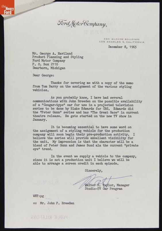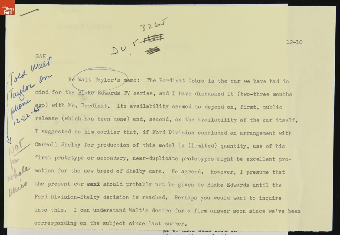 Correspondence between George Haviland, John Breeden and Walt Taylor regarding the Ford XP Bordinat Cobra, December 1965