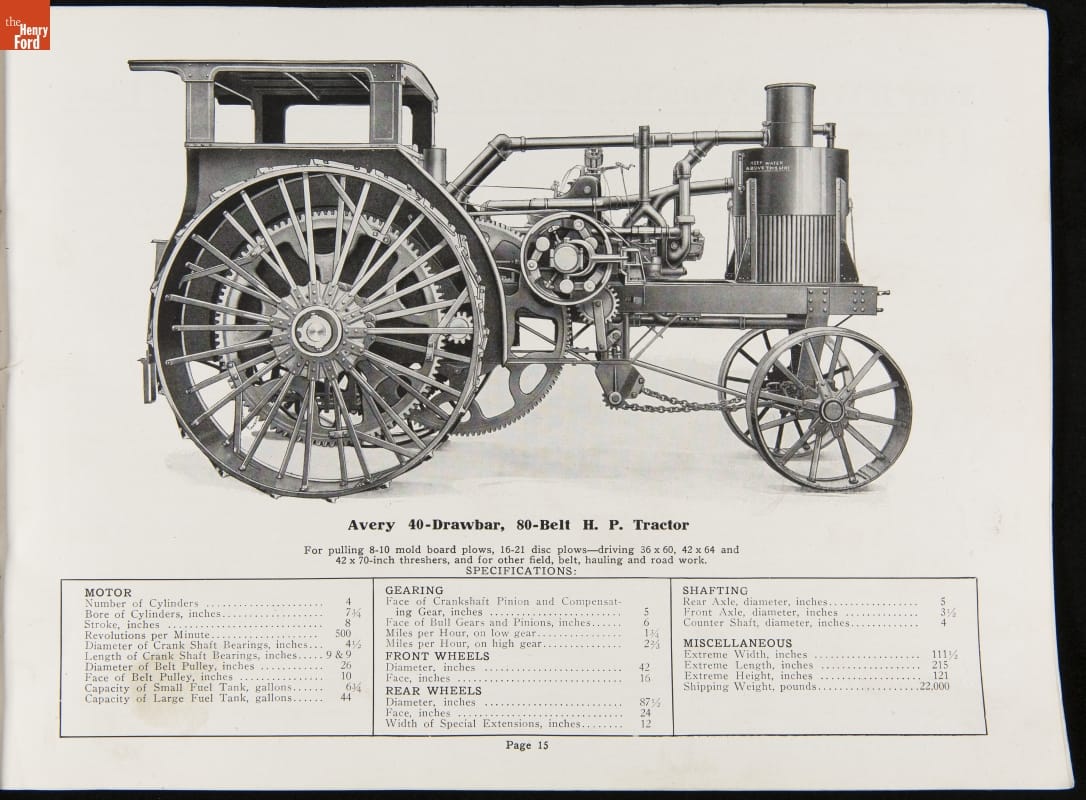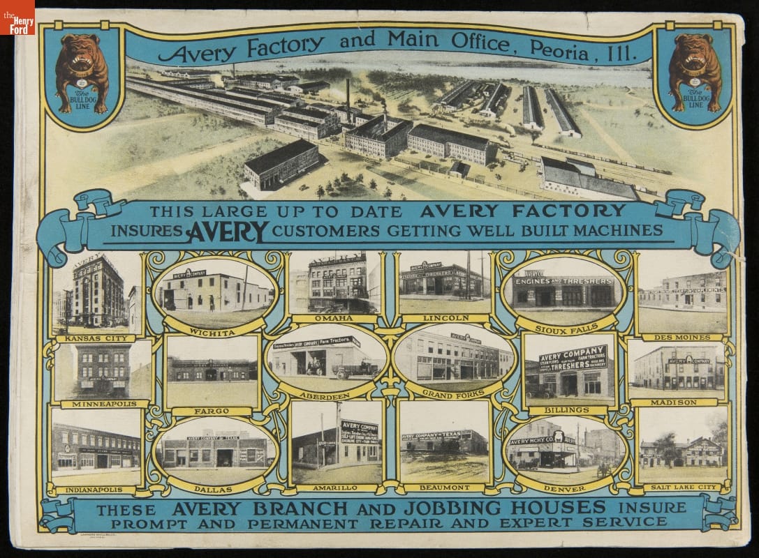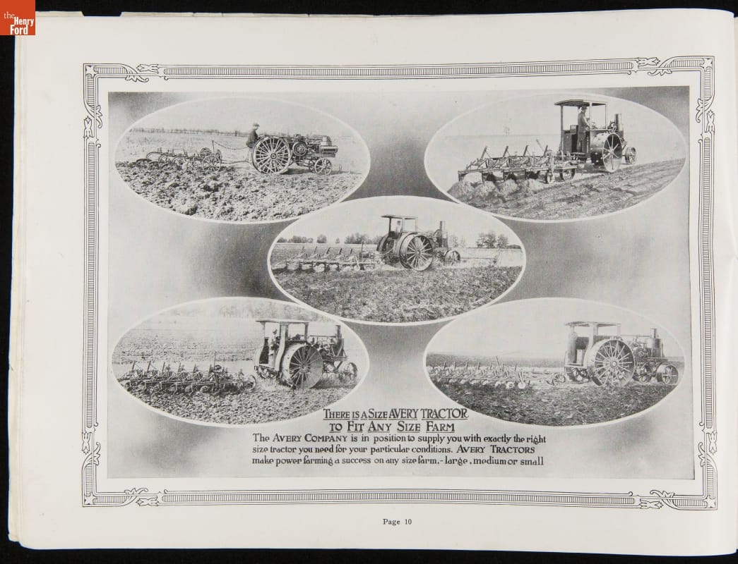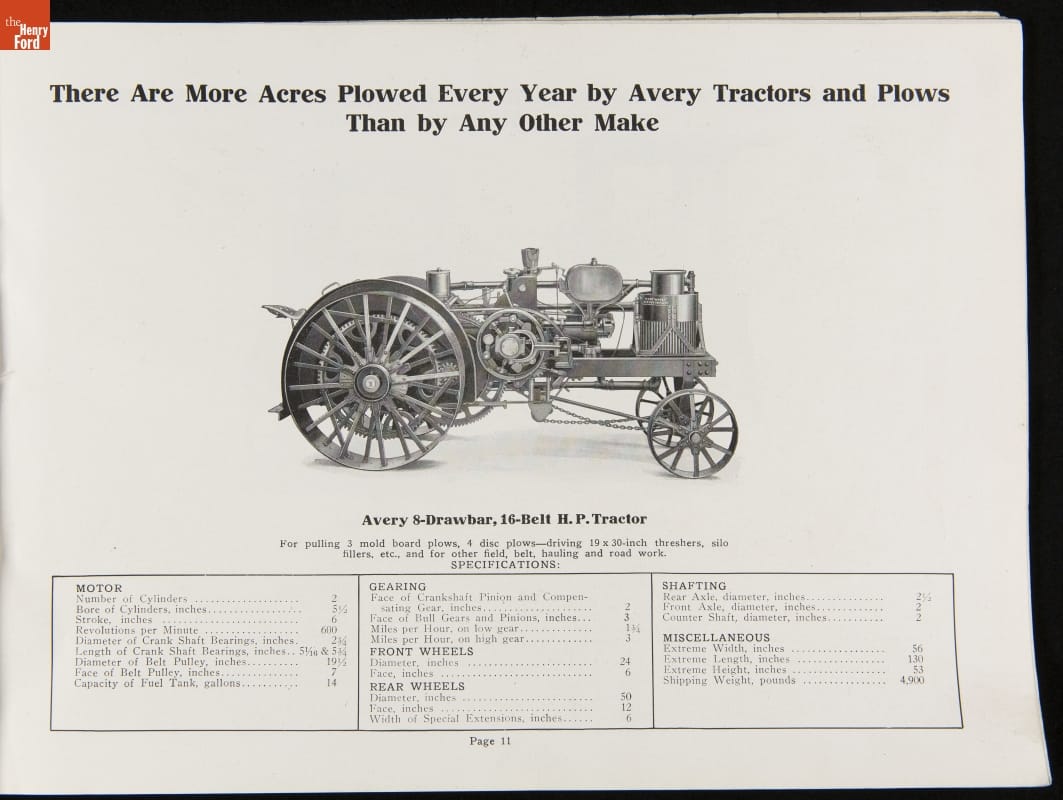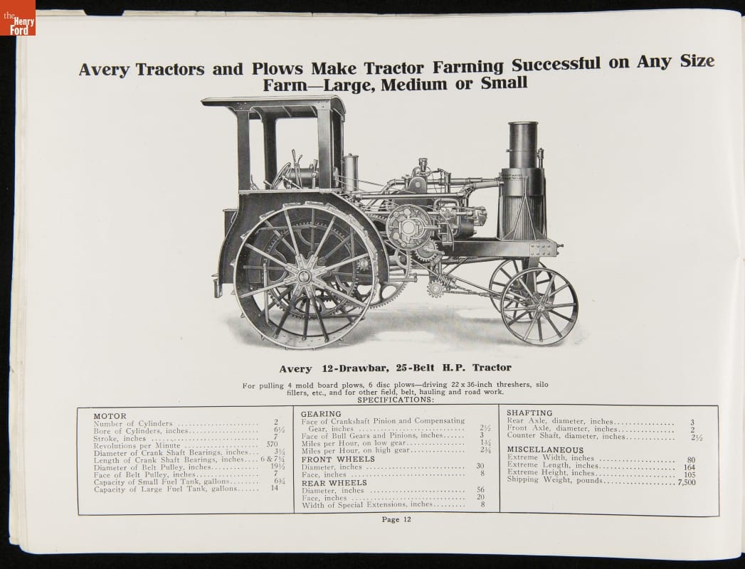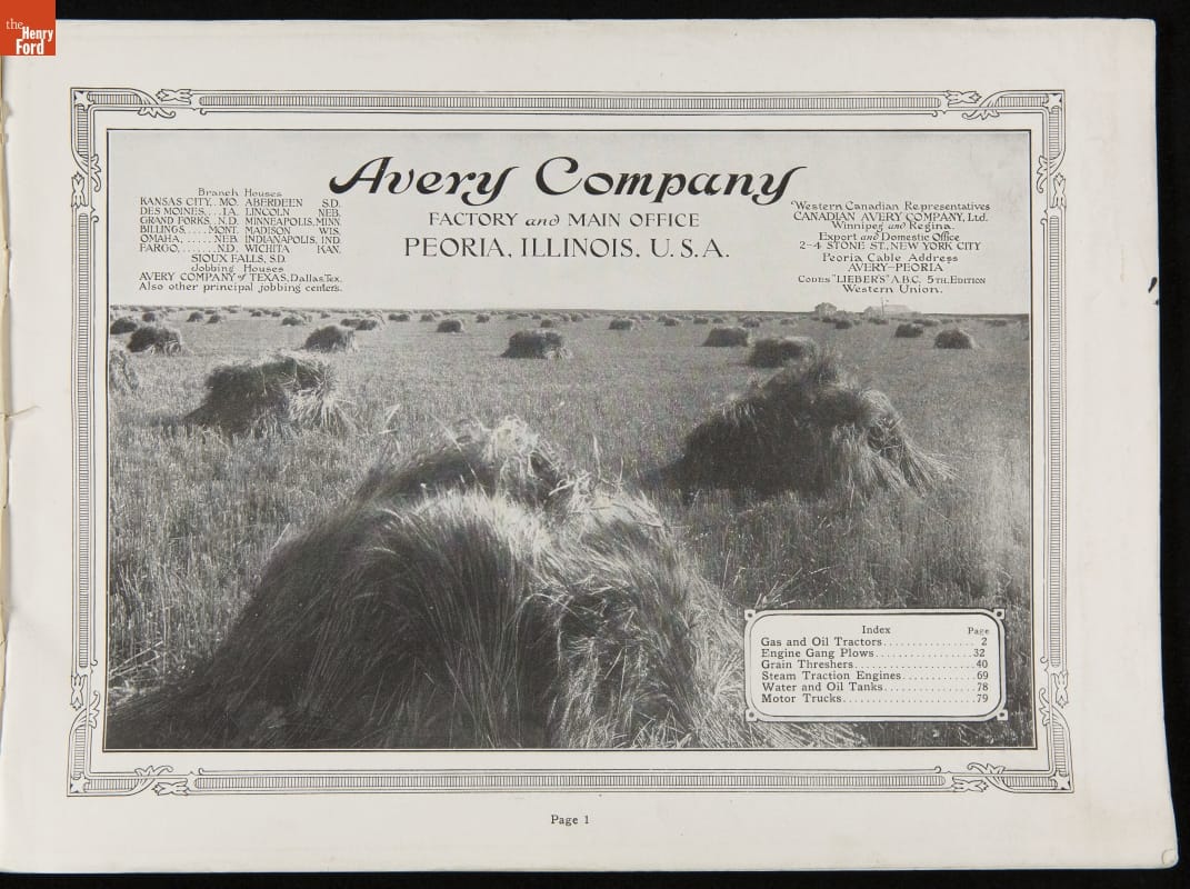 Farmers invested in machinery to reduce the back-breaking labor of agriculture. Two Illinois farm boys, Robert H. and Cyrus M. Avery, incorporated the Avery Planter Company in 1883 to build corn planters, cultivators, and corn-stalk cutters. Avery added steam traction engines and threshing machines in 1891 as grain farms proliferated. This 1916 catalog featured gas, oil, and steam engines at work.