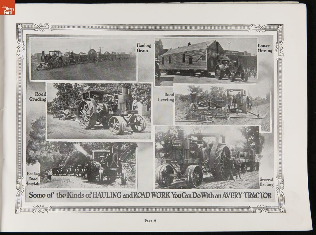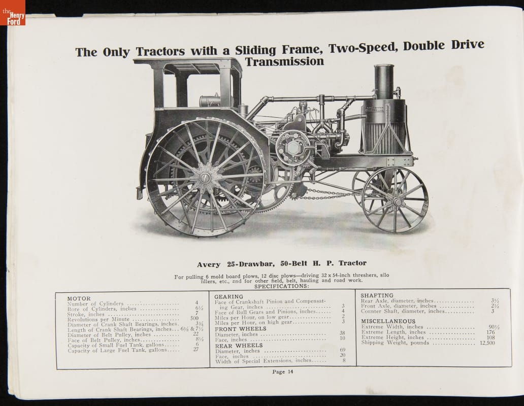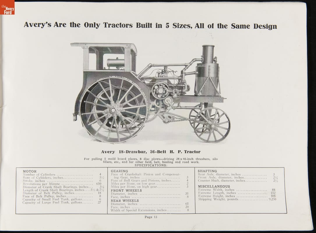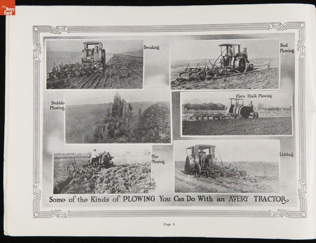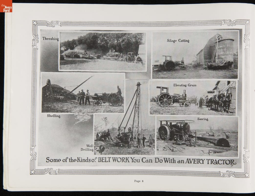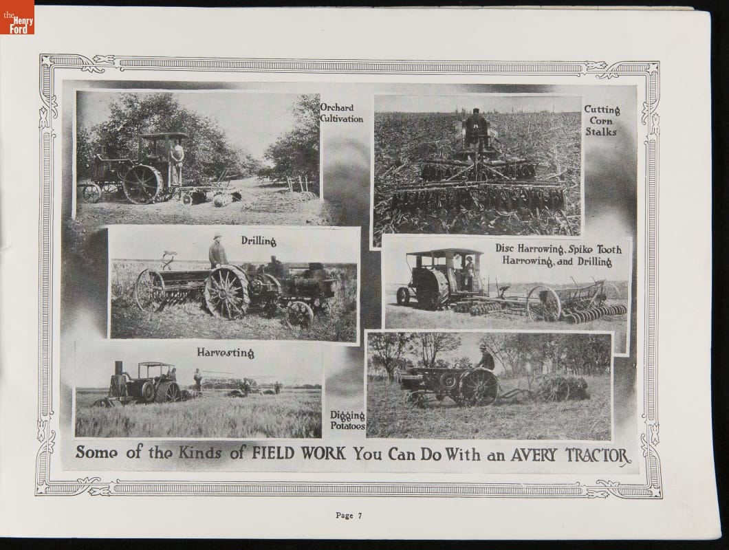 Farmers invested in machinery to reduce the back-breaking labor of agriculture. Two Illinois farm boys, Robert H. and Cyrus M. Avery, incorporated the Avery Planter Company in 1883 to build corn planters, cultivators, and corn-stalk cutters. Avery added steam traction engines and threshing machines in 1891 as grain farms proliferated. This 1916 catalog featured gas, oil, and steam engines at work.