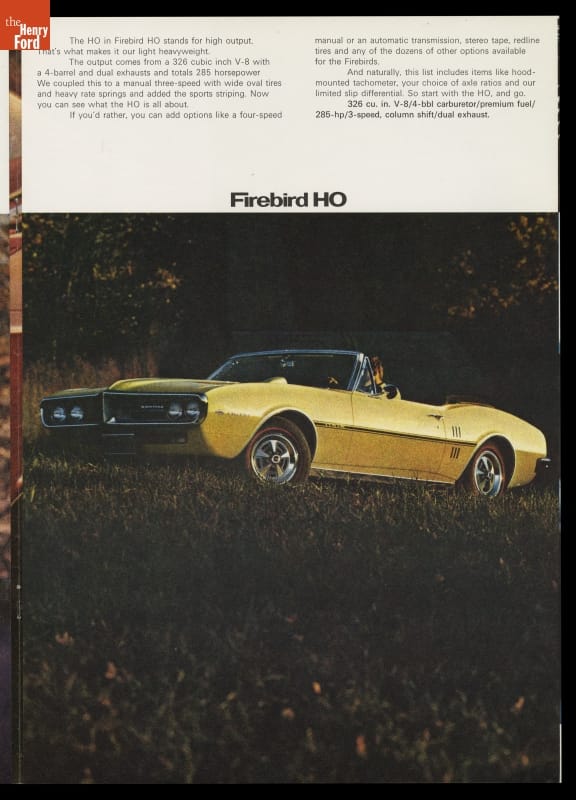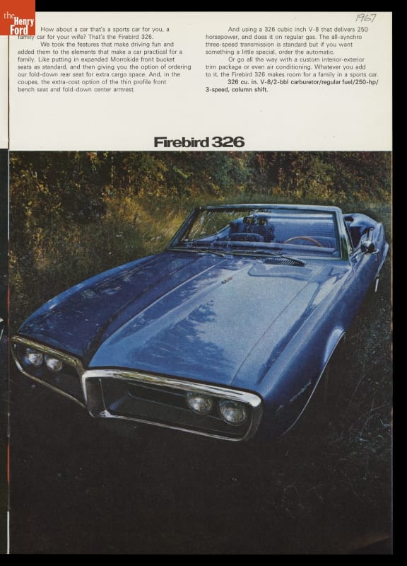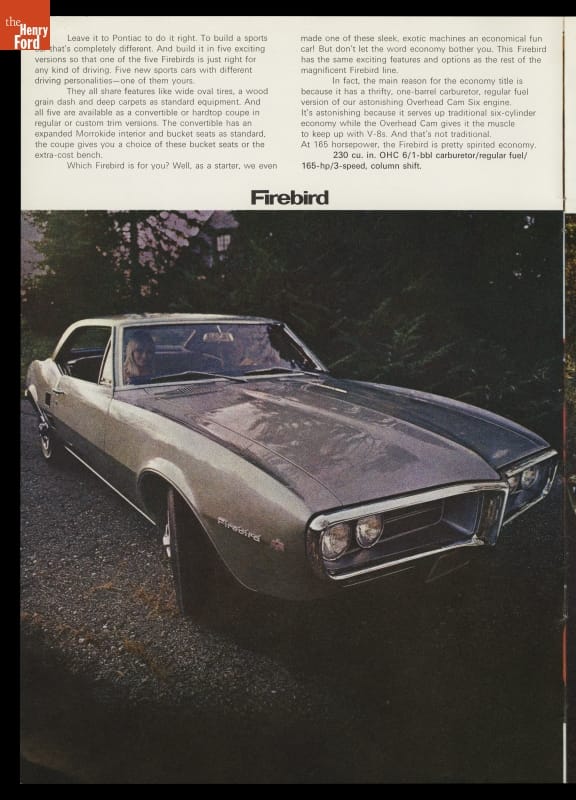 Hot on the heels of the Ford Mustang and the Chevrolet Camaro, Pontiac introduced its own "pony car" in February 1967: the Pontiac Firebird. True to the pony car formula, Firebird had long hood/short deck styling, an affordable base price, and a wealth of options and packages that allowed buyers to customize the car to their tastes.