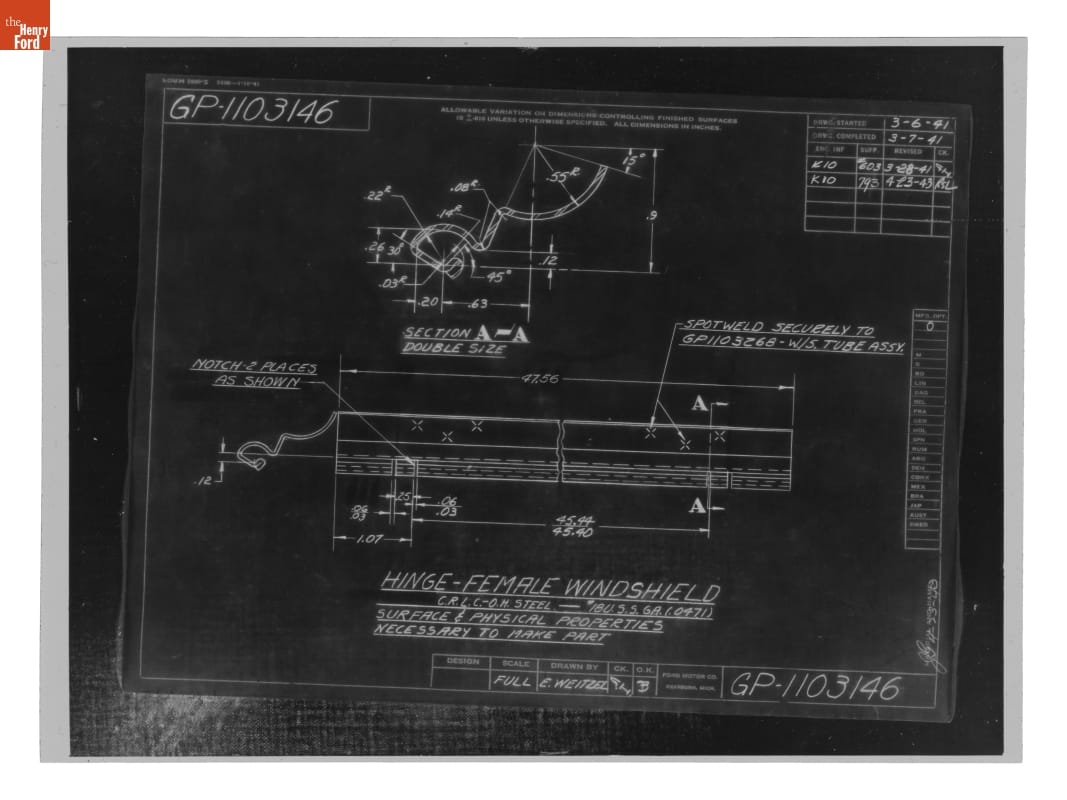 The Ford Motor Company created over a million parts drawings from 1903 to 1957. Many of these drawings specify engineering requirements for the components of Ford-made vehicles--including automobiles, trucks, tractors, military vehicles and Tri-motor airplanes. Others document assembly components, stages of casting and forging, or experimental designs. Beginning in the 1940s, Ford transferred the drawings to microfilm.