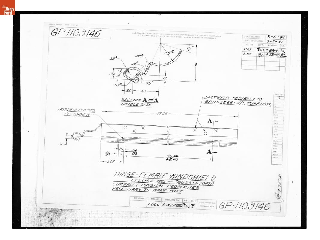 Drawing, "Hinge - Female Windshield," Ford GP, April 23, 1943