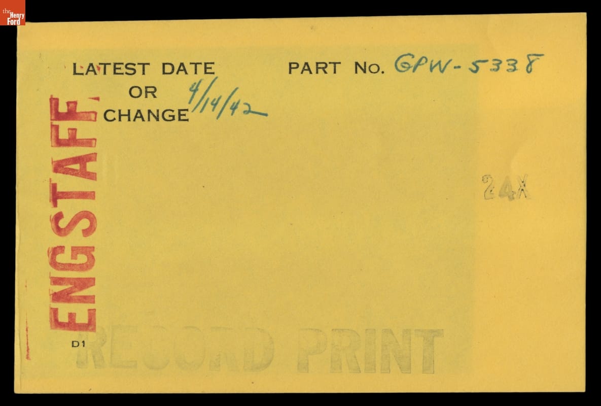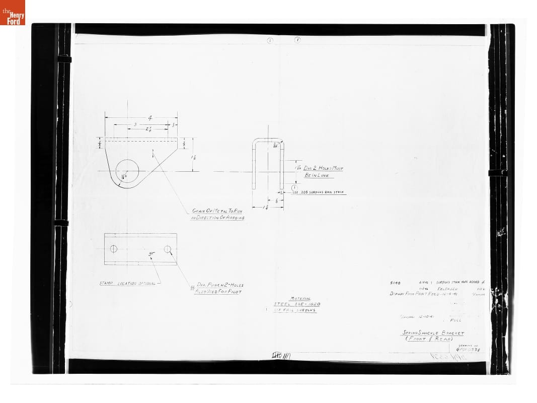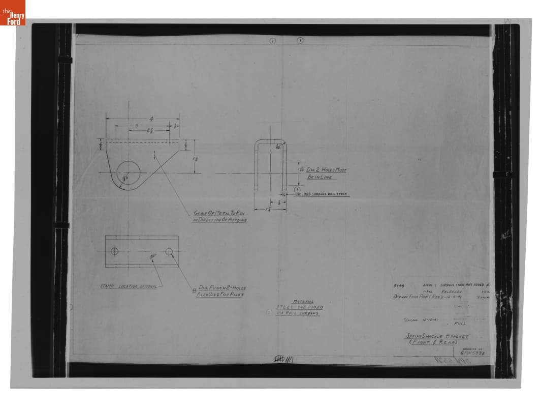 The Ford Motor Company created over a million parts drawings from 1903 to 1957. Many of these drawings specify engineering requirements for the components of Ford-made vehicles--including automobiles, trucks, tractors, military vehicles and Tri-motor airplanes. Others document assembly components, stages of casting and forging, or experimental designs. Beginning in the 1940s, Ford transferred the drawings to microfilm.