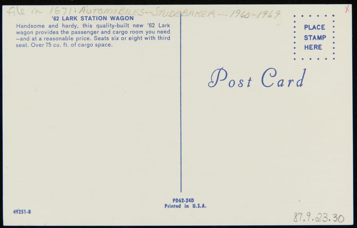 Postcard Advertising the Studebaker Lark Station Wagon, 1962