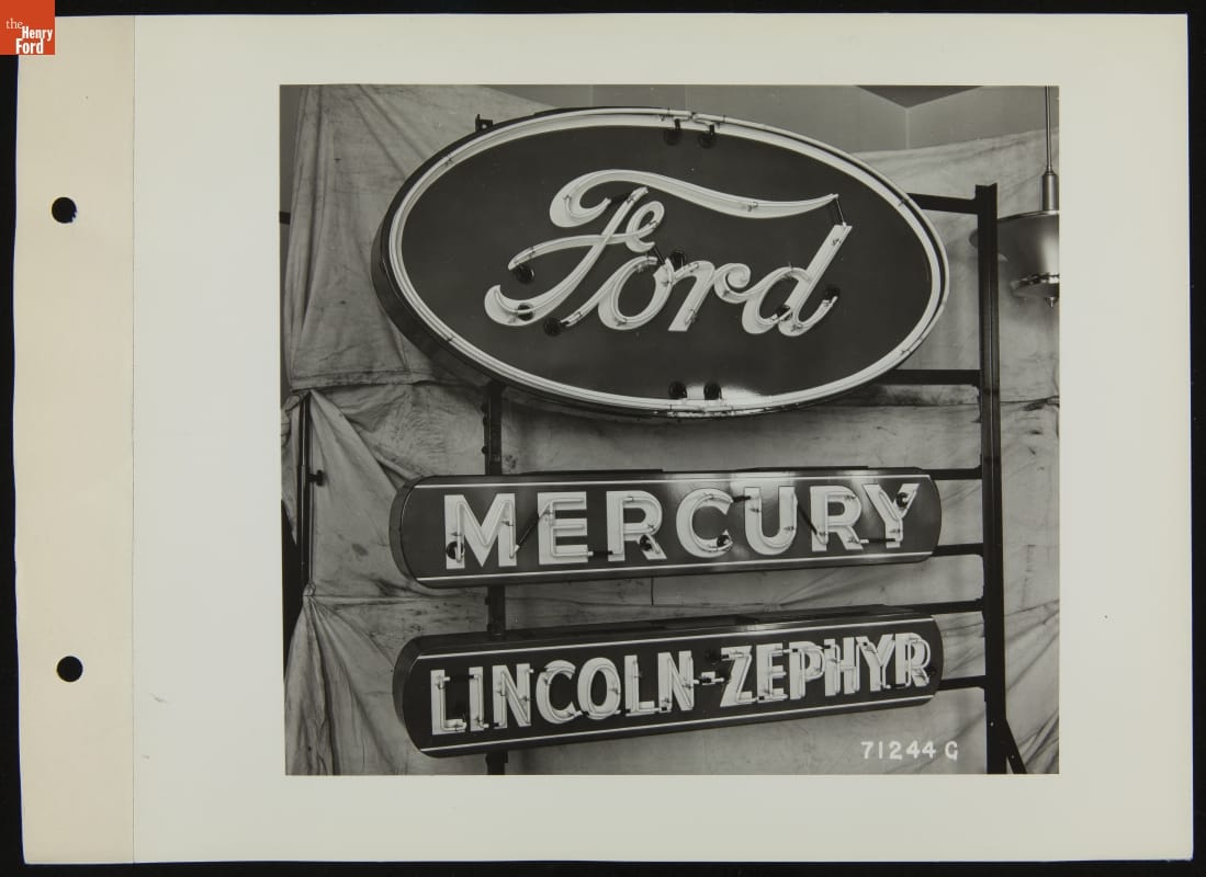 Ford, Lincoln-Zephyr, and Mercury Neon Automobile Dealers' Sign, December 1938