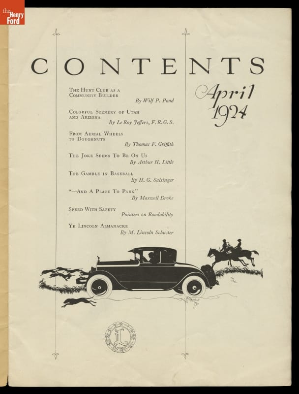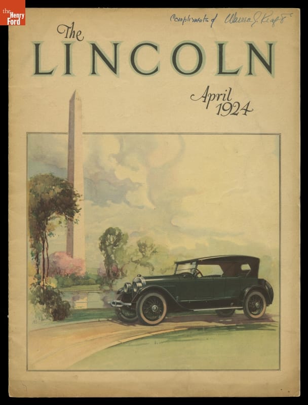 Memorials to two presidents are seen on the cover of the April 1924 issue of The Lincoln, Lincoln Motor Company's promotional magazine. The Washington Monument provides an elegant backdrop for a 1924 Lincoln Model L touring car. Company founder Henry Leland named the automaker in honor of the first president for whom he had voted: Abraham Lincoln.