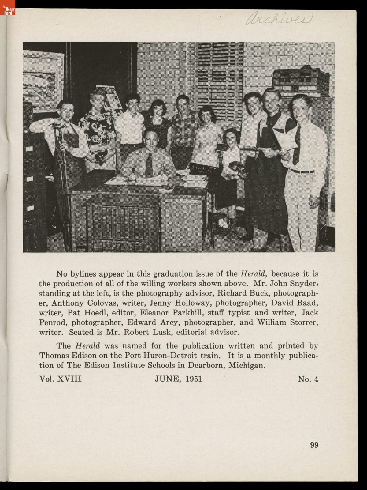 The students of the Greenfield Village and Associated Schools of the Edison Institute began publishing the Herald in 1934. They took the name from a weekly newspaper printed and sold by Thomas Alva Edison when he worked for the Grand Trunk Railroad in 1862-63. The students' version included articles on academic, social, and recreational activities. The publication continued until 1952.