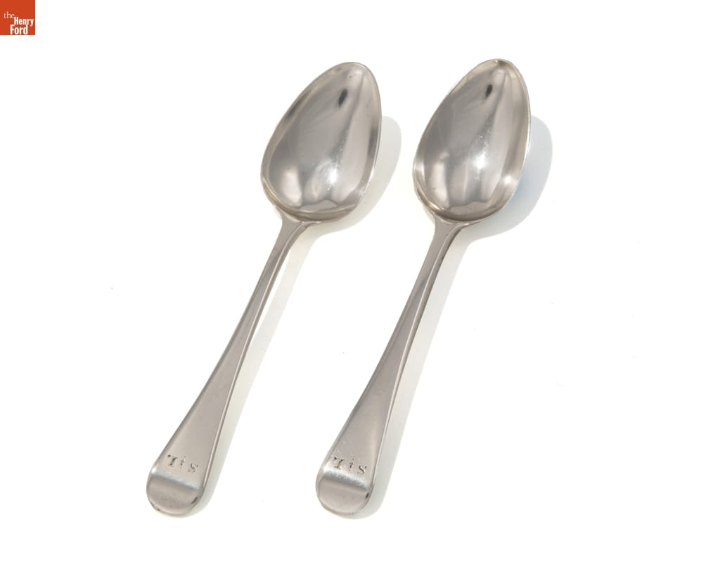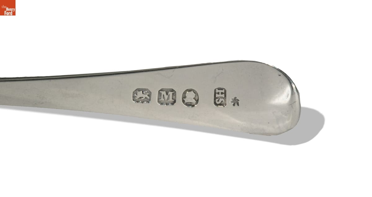 Back of spoon: Lion passant, "M" [date letter], king's head right, "SH" [or "HS"?] in a clipped rectangle, jobber's mark of a mullett.