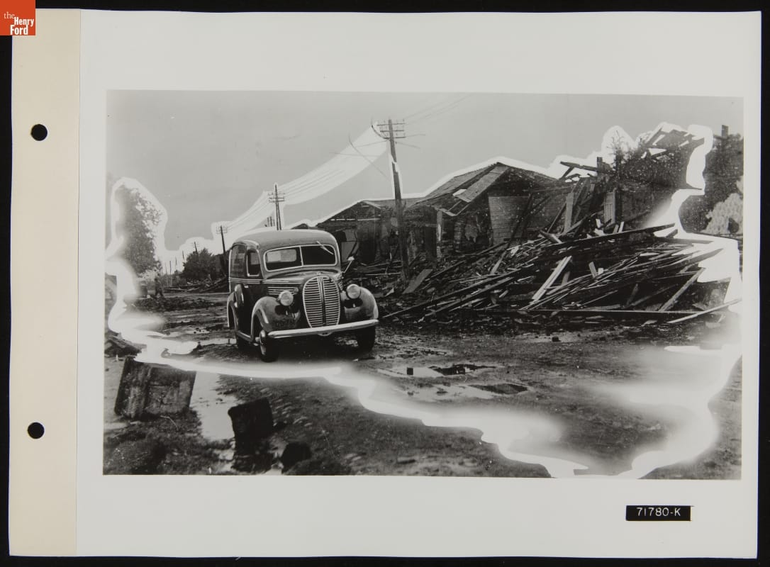 Parts Delivery Car with Broken Down Buildings, Illustration in April 1939 Ford Merchandising Bulletin