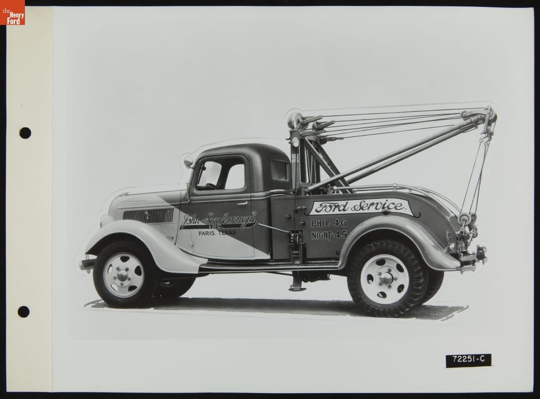 John Scarborough Inc. Tow Truck, Paris, Texas, Illustration in the August 1939 Ford Merchandising Bulletin