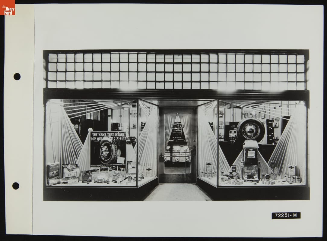 Ford Accessories Dealership Window Display, Illustration in the August 1939 Ford Merchandising Bulletin