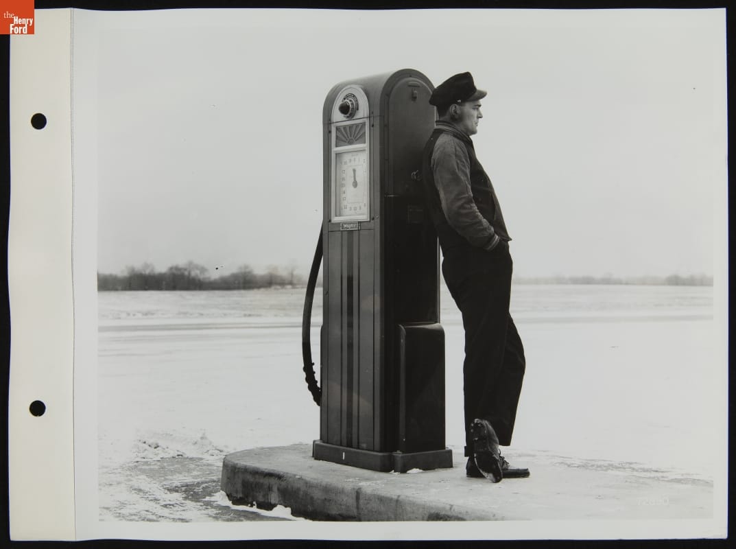 Gas Station Attendant Standing at Fuel Pump, January 1940
