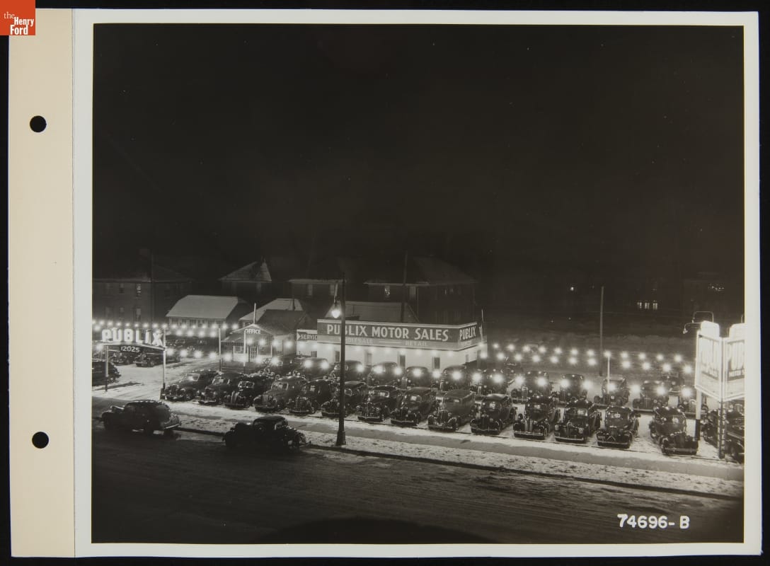 Night View of Publix Motor Sales, Used Car Lot, December 1940
