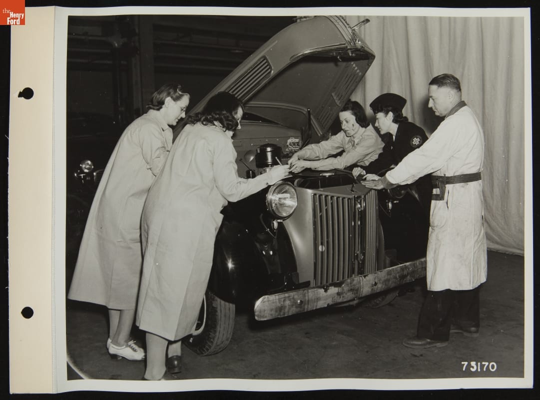 In 1941, Ford Motor Company provided automobile maintenance classes at its Highland Park facilities for the local Red Cross Volunteer Motor Corps. Instructors trained the volunteers in the mechanical skills they would need to keep their vehicles moving in times of emergency. Along with providing space for training, Ford also donated its 29 millionth Ford vehicle to the humanitarian organization.