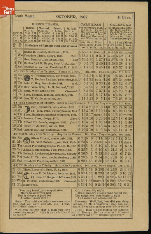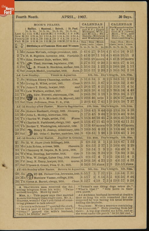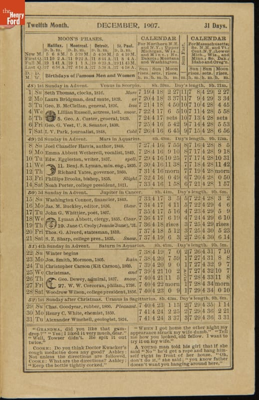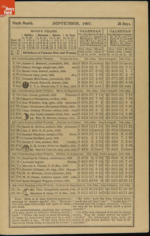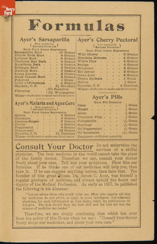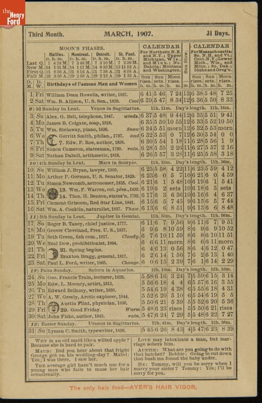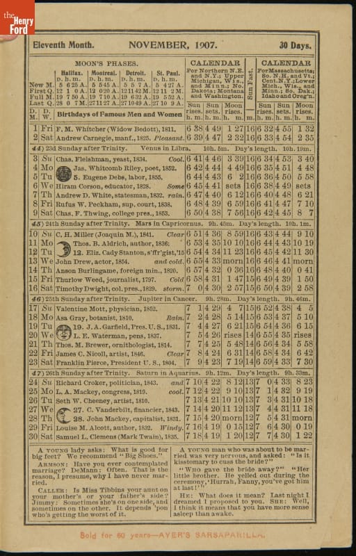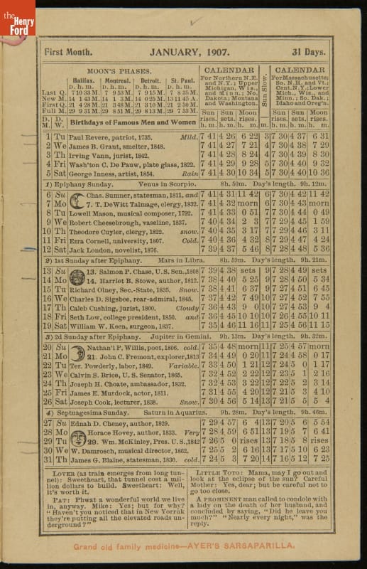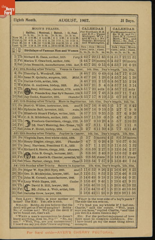 Almanacs contained practical information about the coming year. Readers normally found a calendar, weather predictions, tide schedules, and information related to astronomical events, agriculture, health, politics and other matters. Interspersed were jokes and witty sayings. Beginning in the late 1800s, James Cook Ayer, a keen advertiser and successful patent medicine dealer, published almanacs to entice the public to buy his line of products.