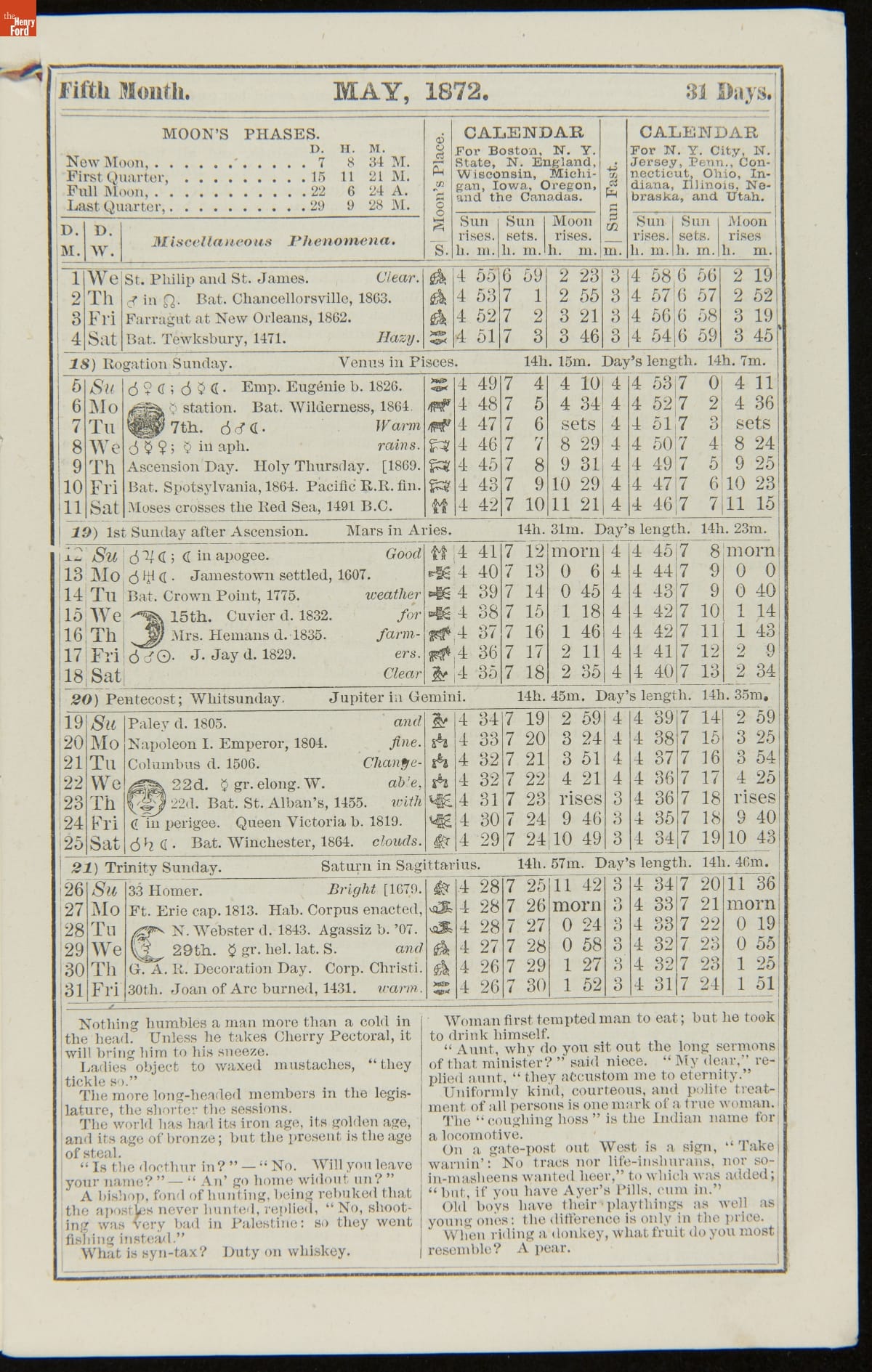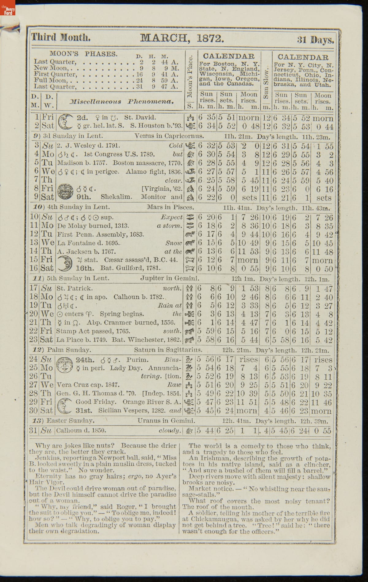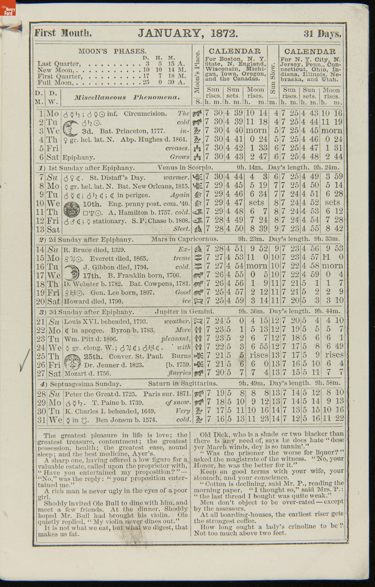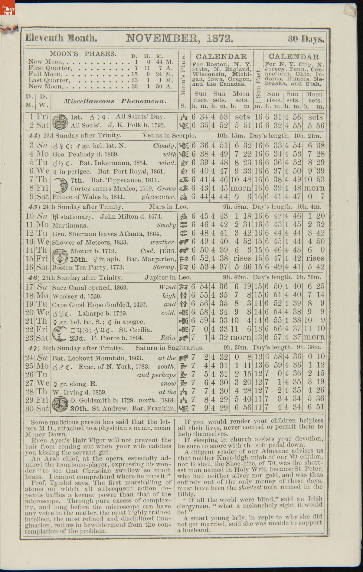 Almanacs contained practical information about the coming year. Readers normally found a calendar, weather predictions, tide schedules, and information related to astronomical events, agriculture, health, politics and other matters. Interspersed were jokes and witty sayings. Beginning in the late 1800s, James Cook Ayer, a keen advertiser and successful patent medicine dealer, published almanacs to entice the public to buy his line of products.