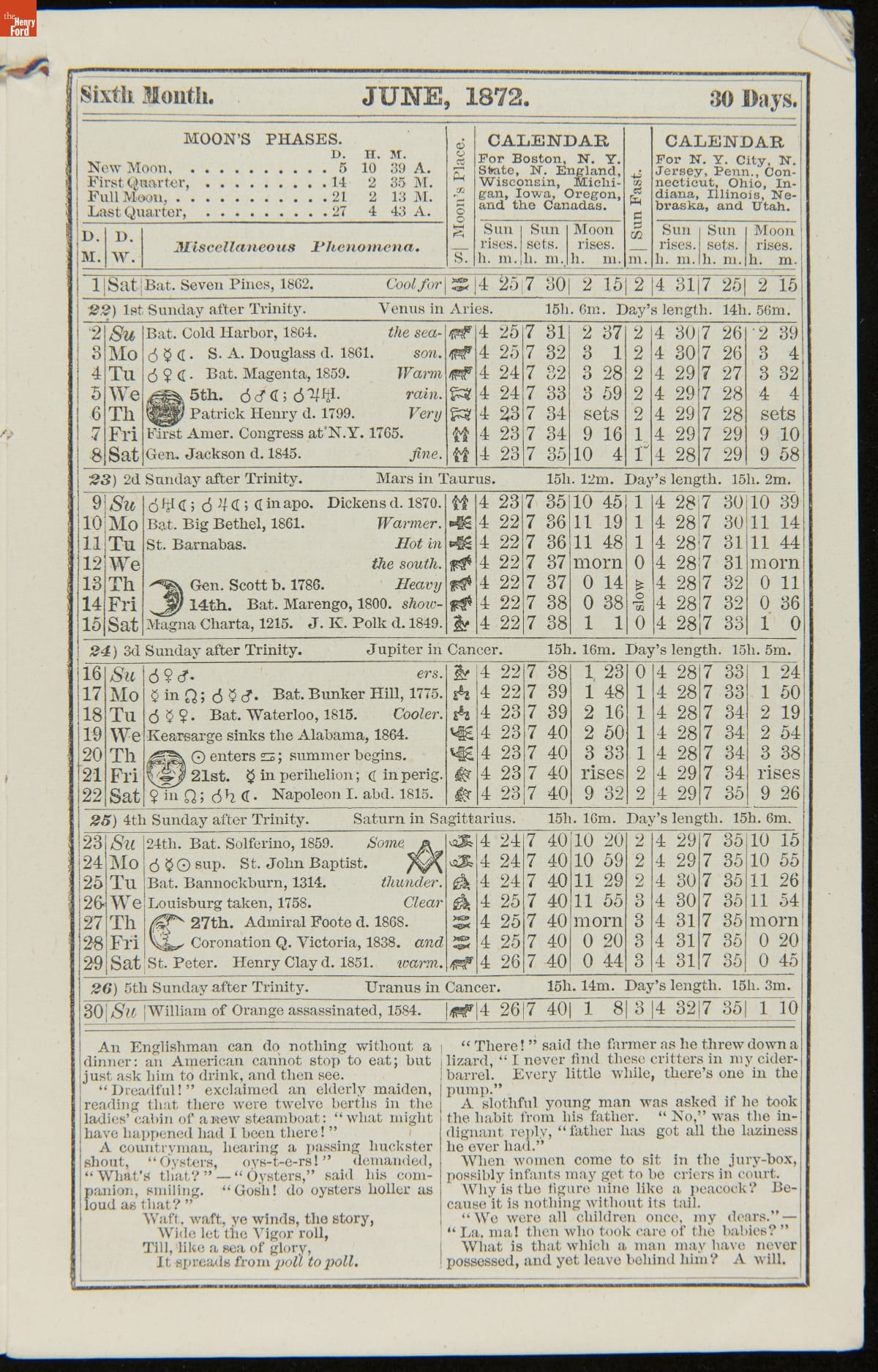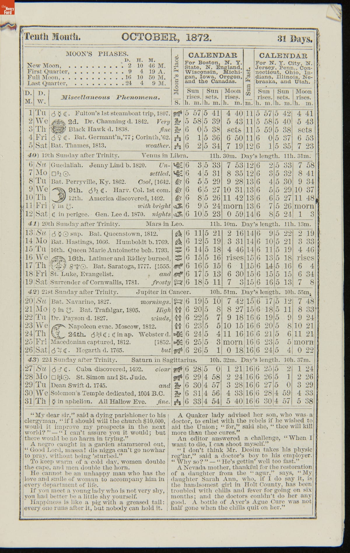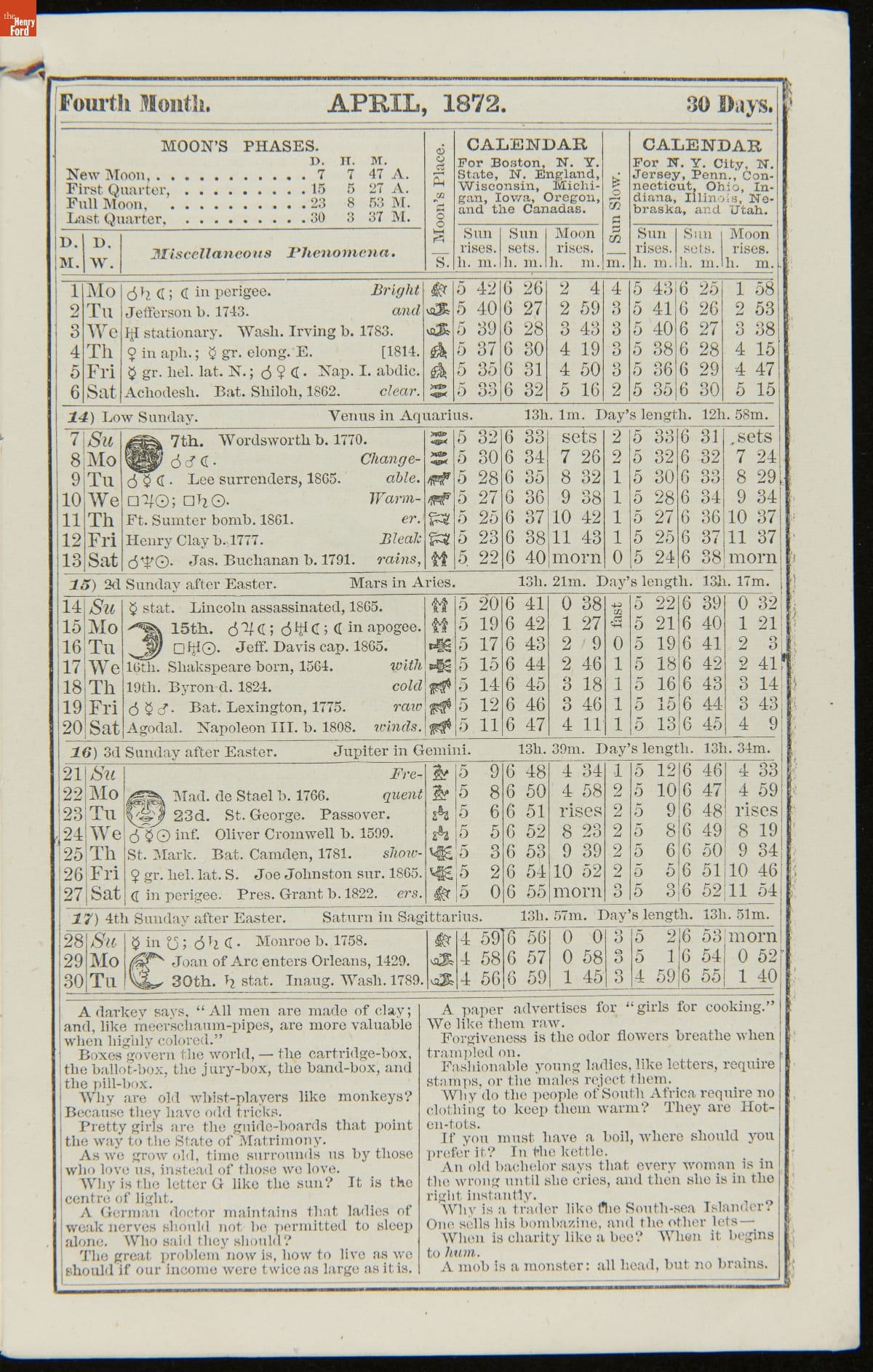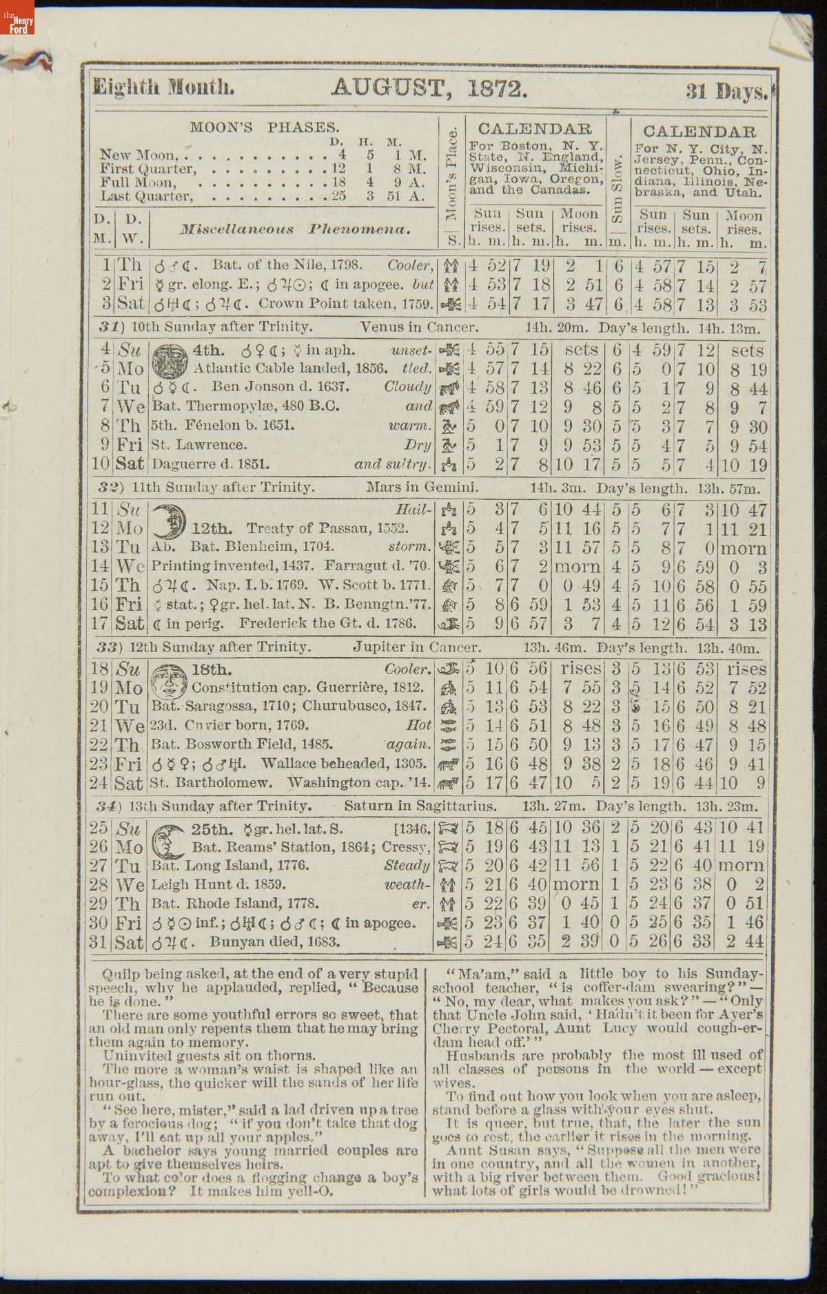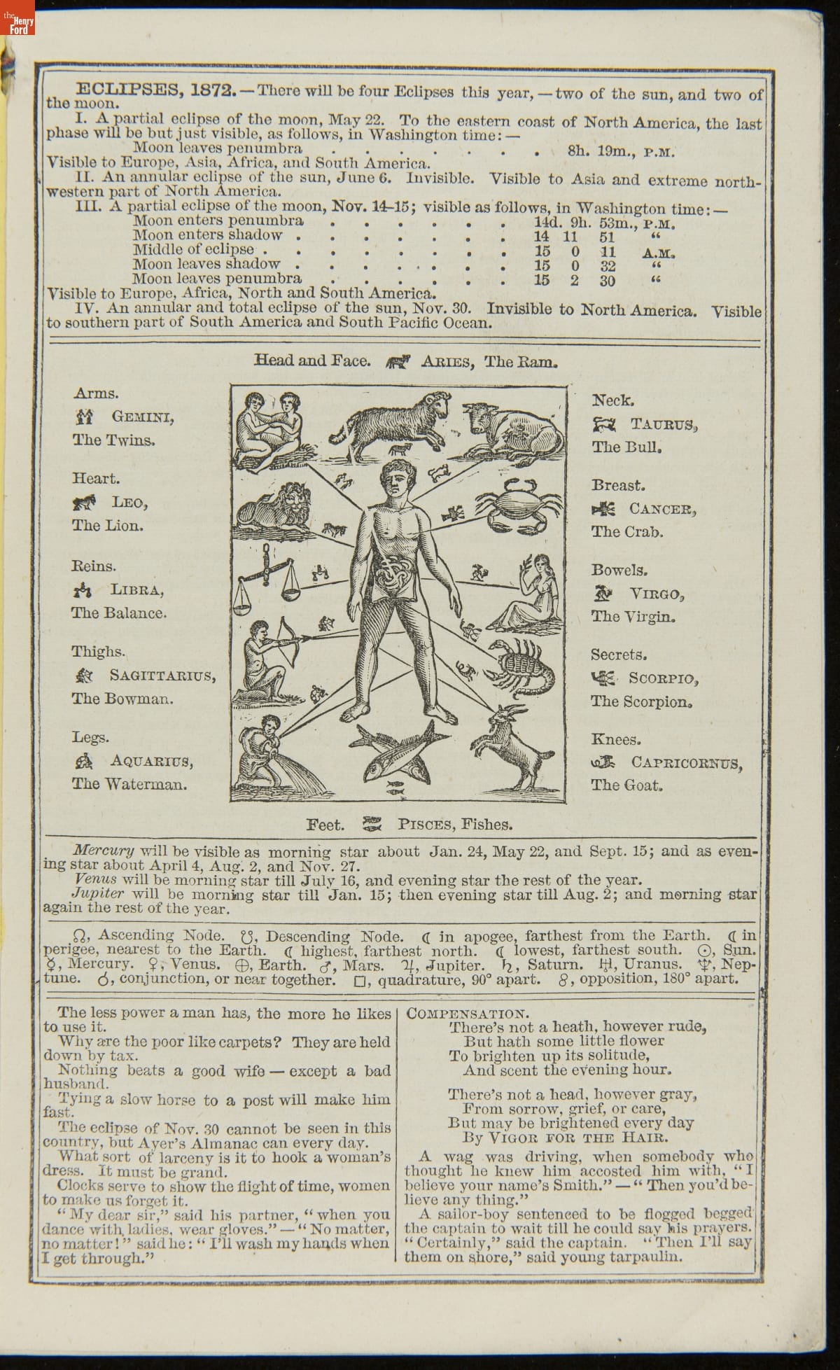 Almanacs contained practical information about the coming year. Readers normally found a calendar, weather predictions, tide schedules, and information related to astronomical events, agriculture, health, politics and other matters. Interspersed were jokes and witty sayings. Beginning in the late 1800s, James Cook Ayer, a keen advertiser and successful patent medicine dealer, published almanacs to entice the public to buy his line of products.