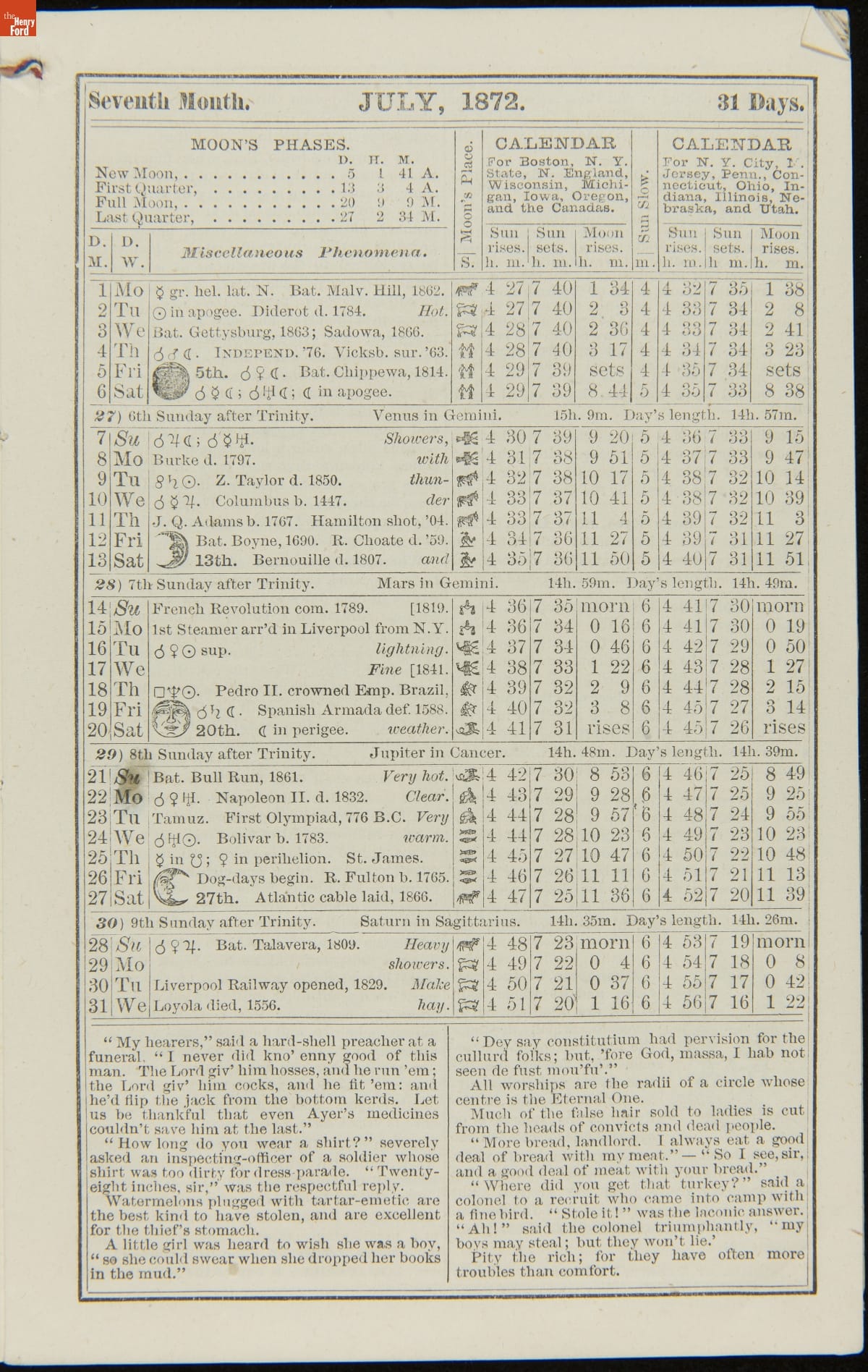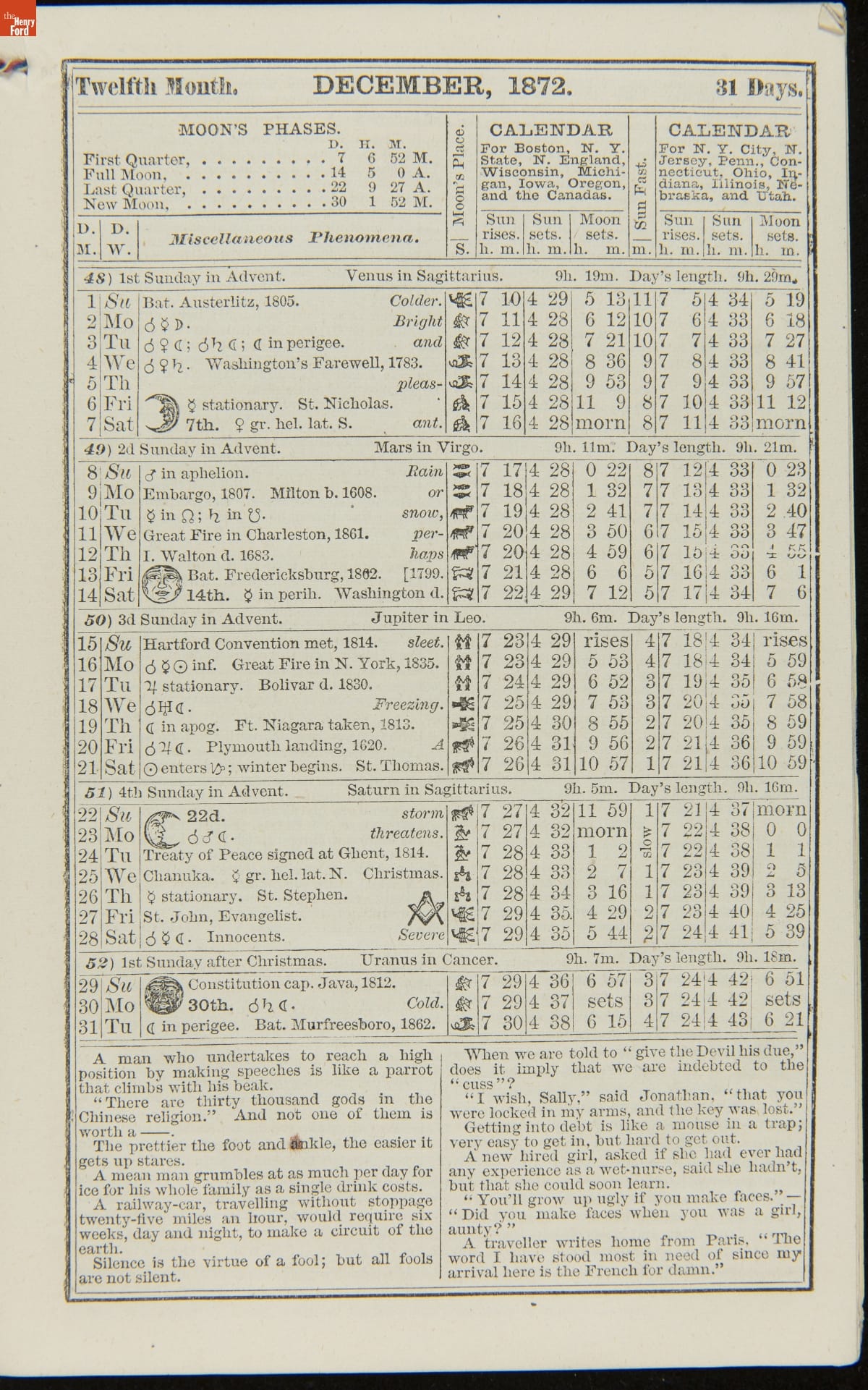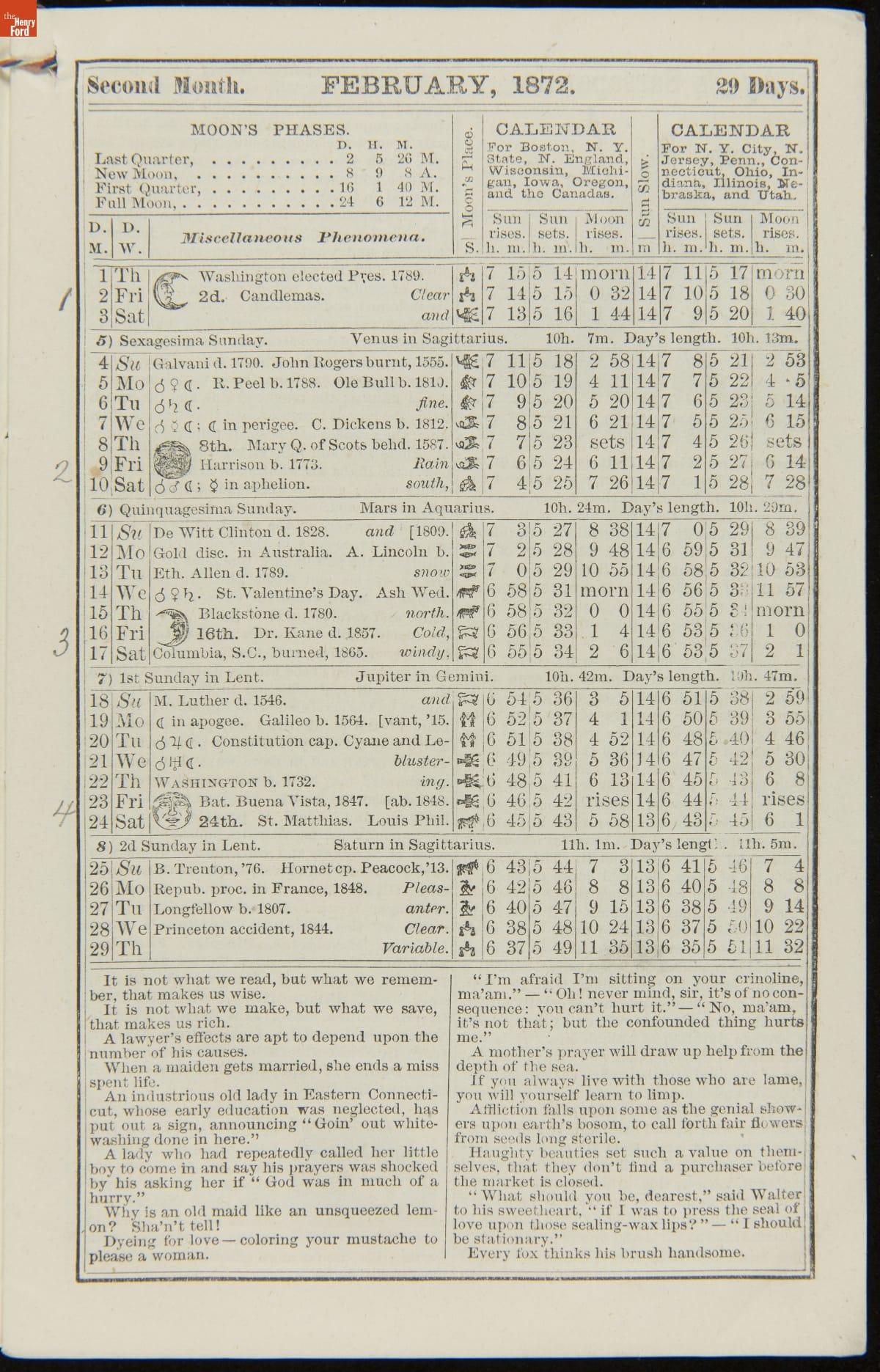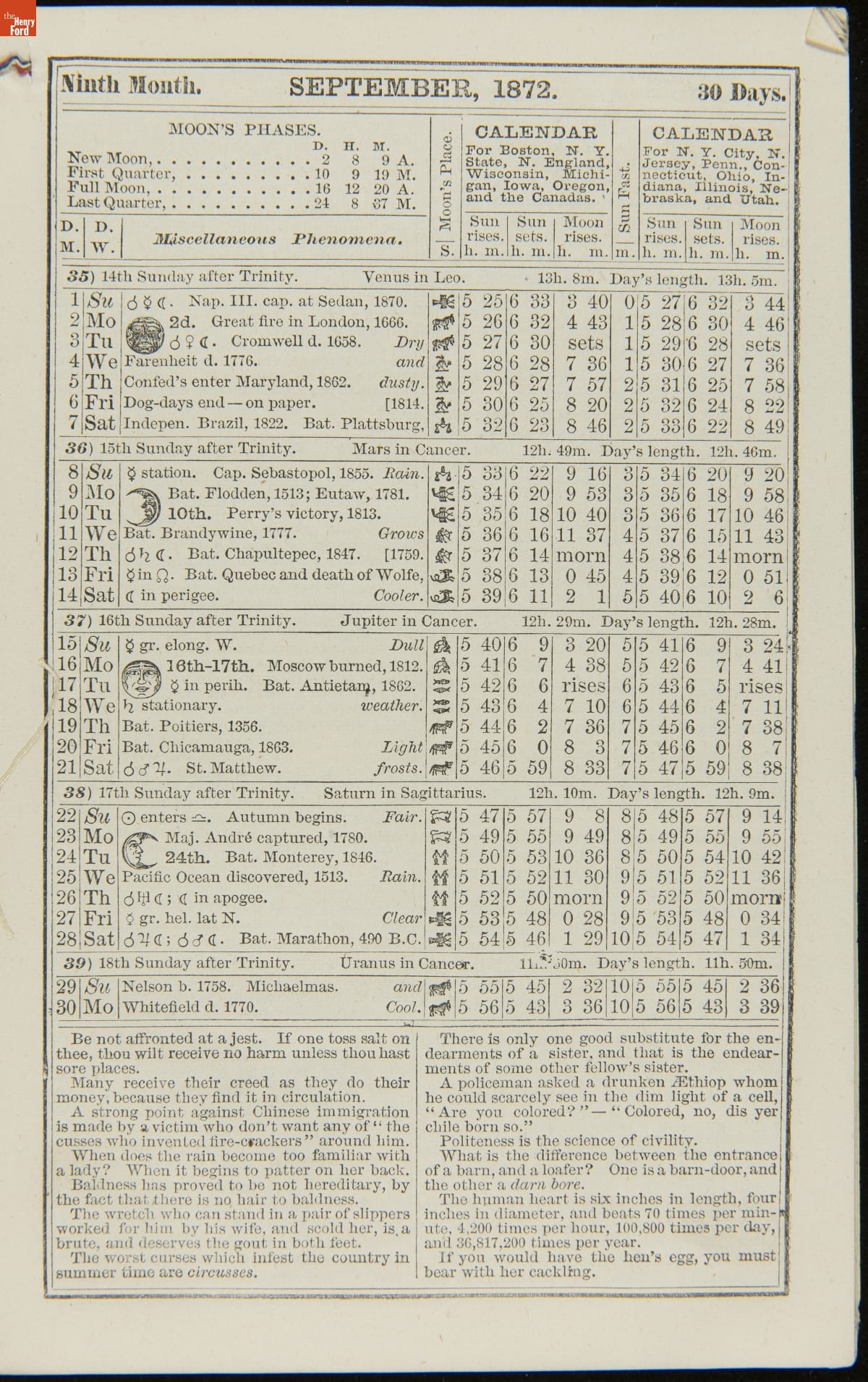 Almanacs contained practical information about the coming year. Readers normally found a calendar, weather predictions, tide schedules, and information related to astronomical events, agriculture, health, politics and other matters. Interspersed were jokes and witty sayings. Beginning in the late 1800s, James Cook Ayer, a keen advertiser and successful patent medicine dealer, published almanacs to entice the public to buy his line of products.