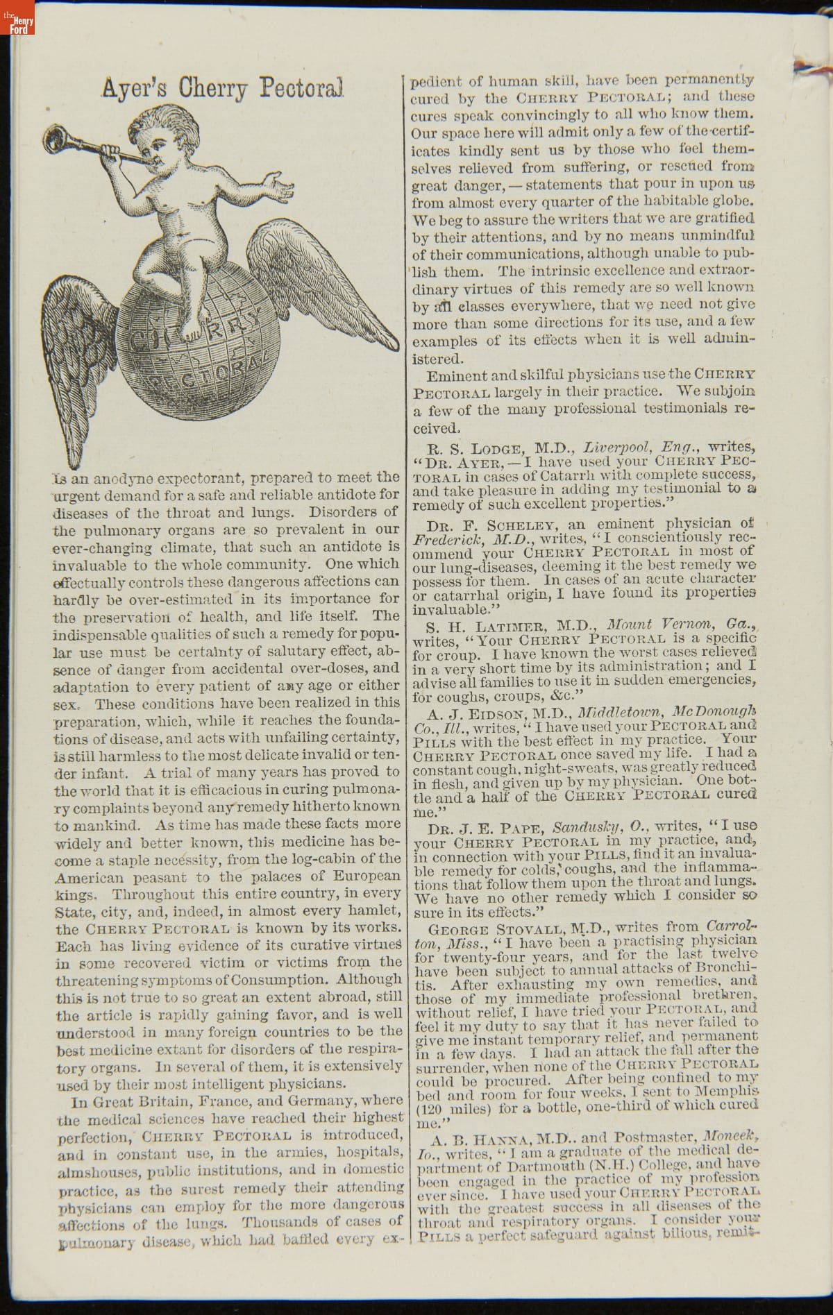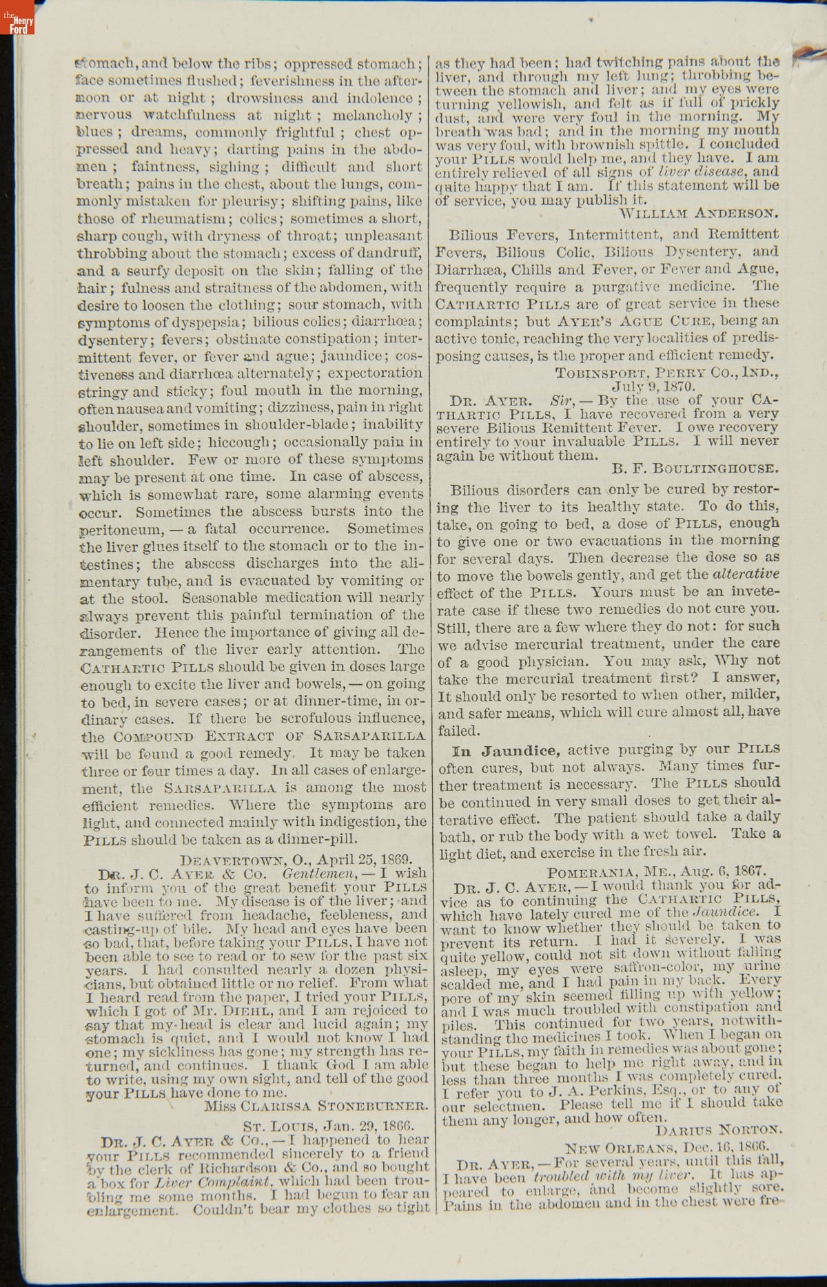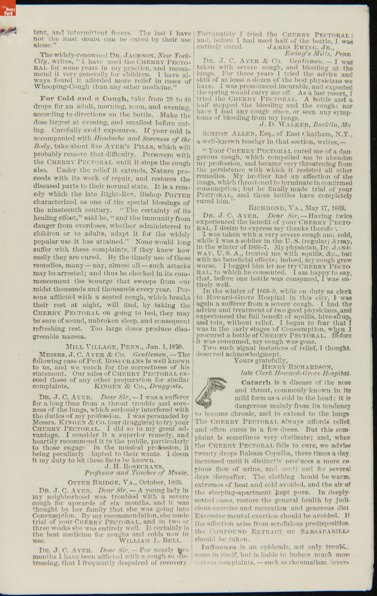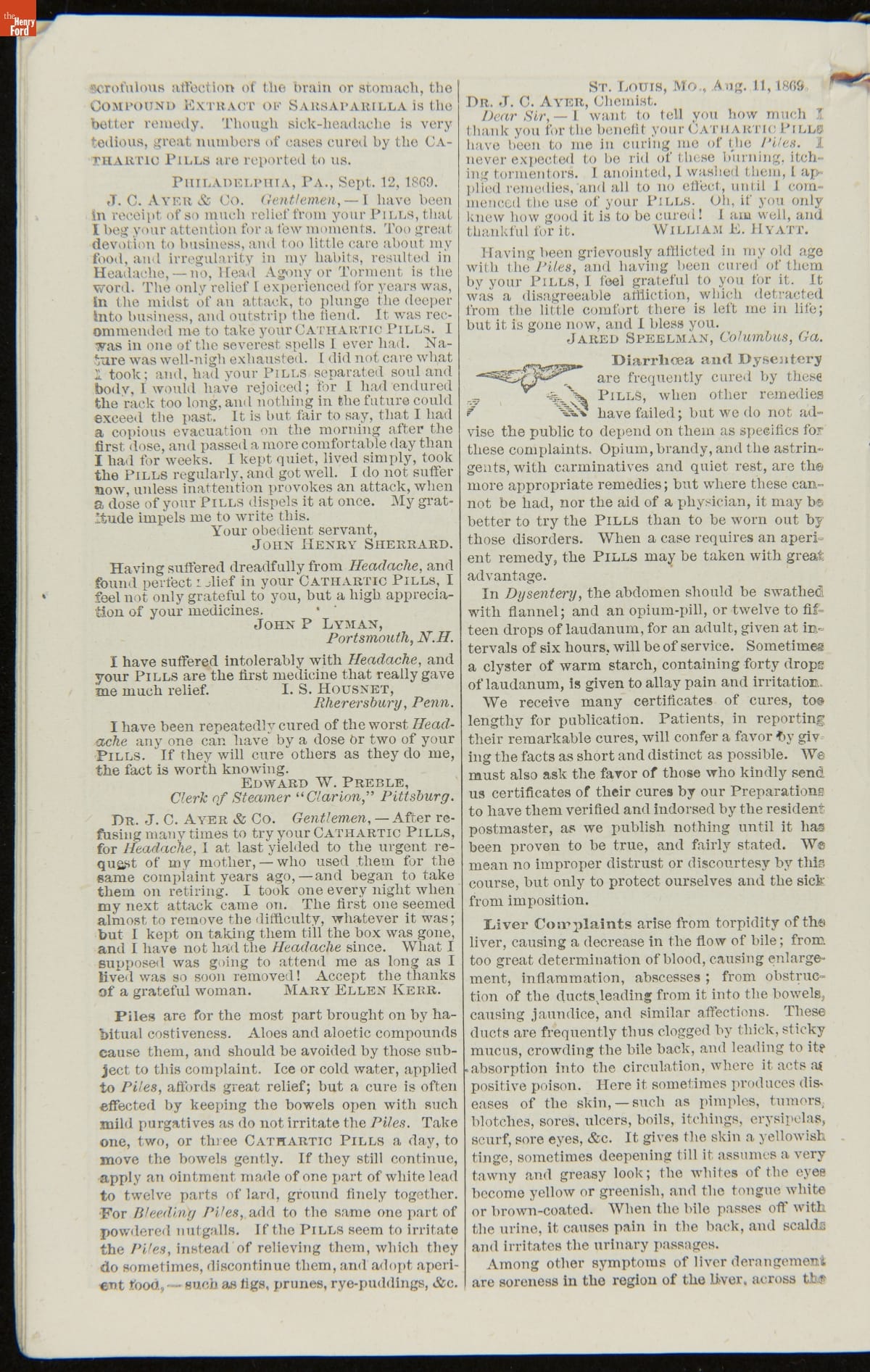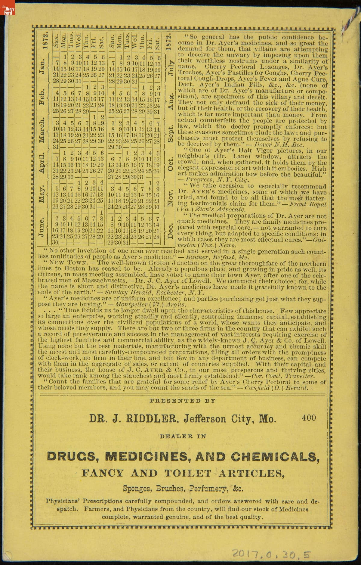 Published by Dr. J.C. Ayer & Co., Lowell, Massachusetts. Distributed by Dr. J. Riddler, Jefferson City, Missouri.
