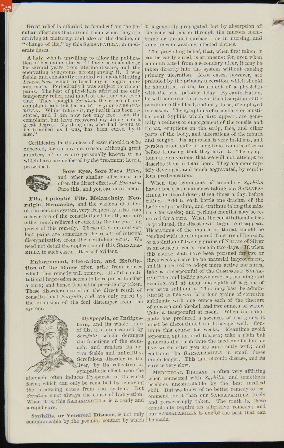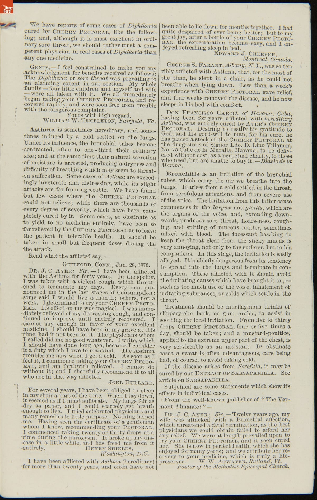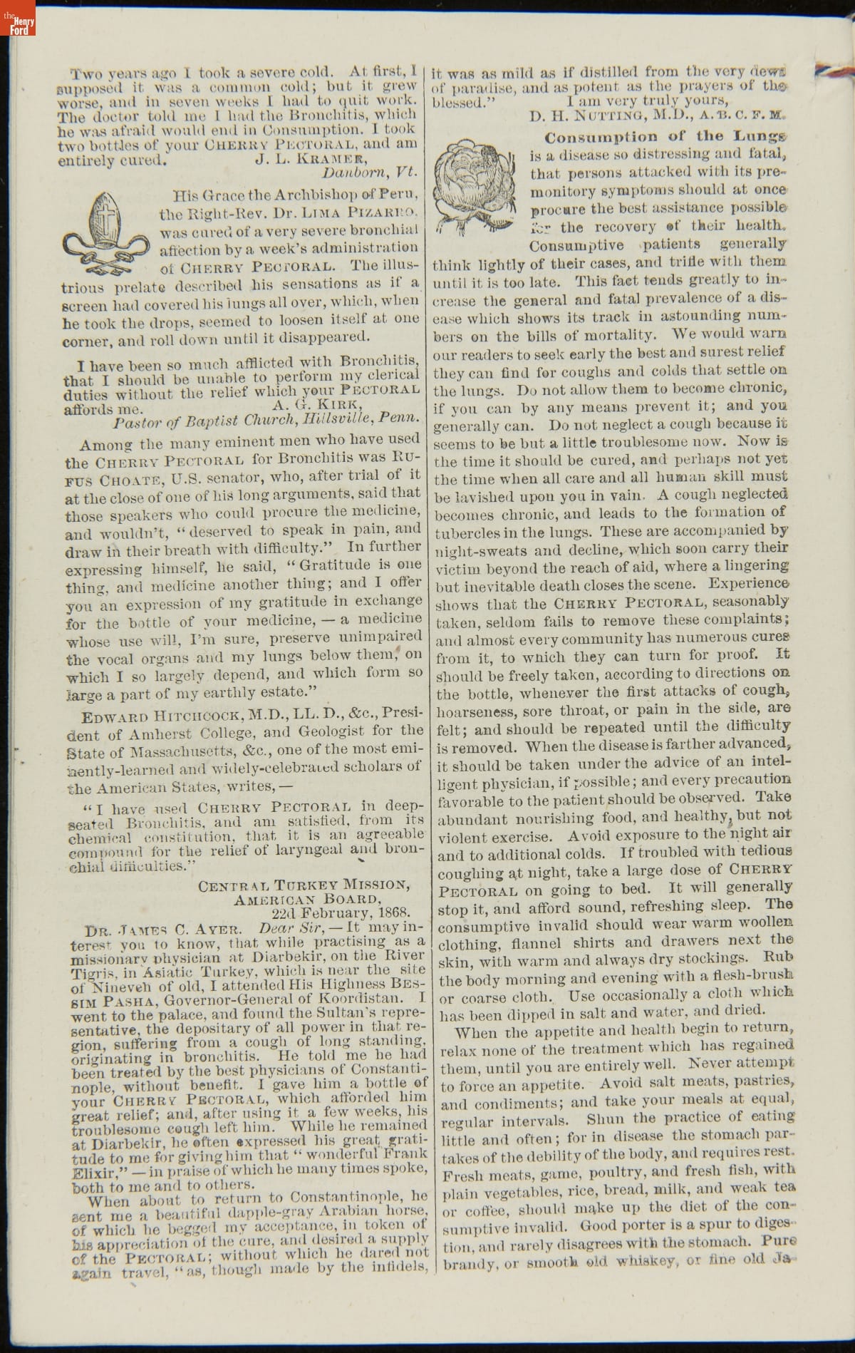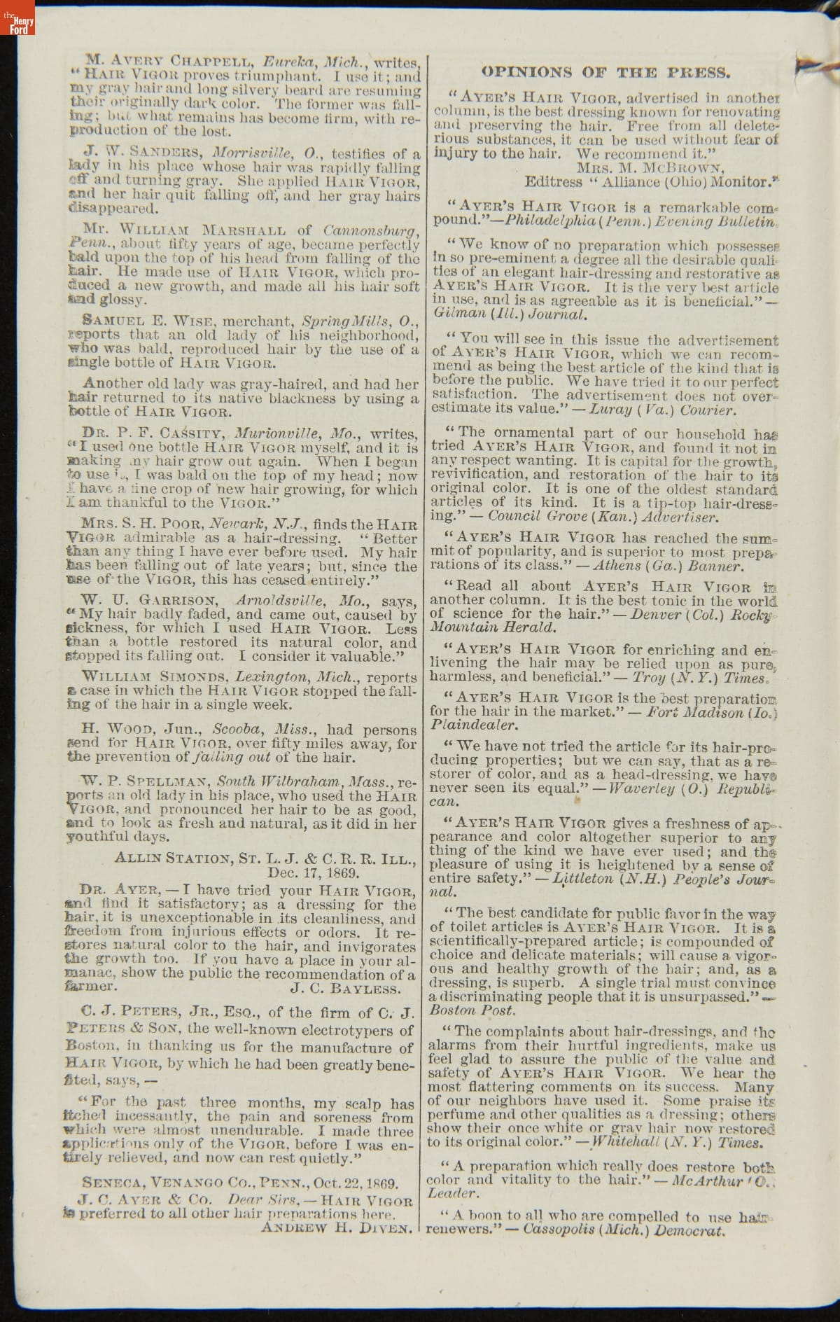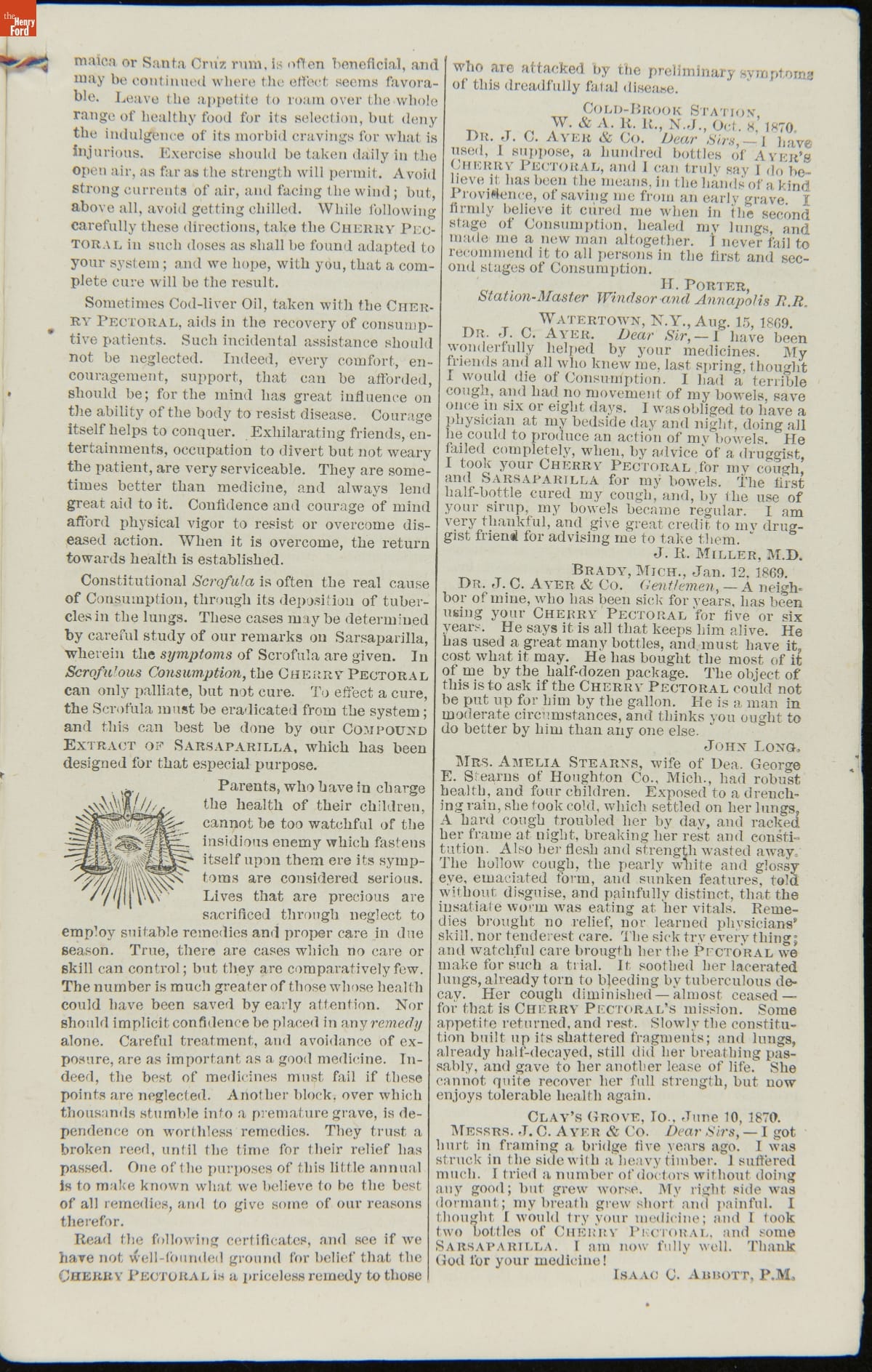 Published by Dr. J.C. Ayer & Co., Lowell, Massachusetts. Distributed by Dr. J. Riddler, Jefferson City, Missouri.