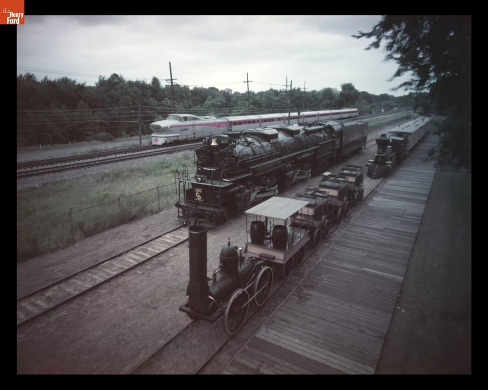 Three historic locomotives from The Henry Ford -- the DeWitt Clinton (replica of the 1831 original), Sam Hill (1858) and Allegheny (1941) -- pose alongside the Aerotrain in 1956. Railroads hoped that the streamlined Aerotrain, designed by General Motors, might lure travelers back onto trains. But its lightweight coaches gave a rough ride and Aerotrain failed to catch on with passengers.