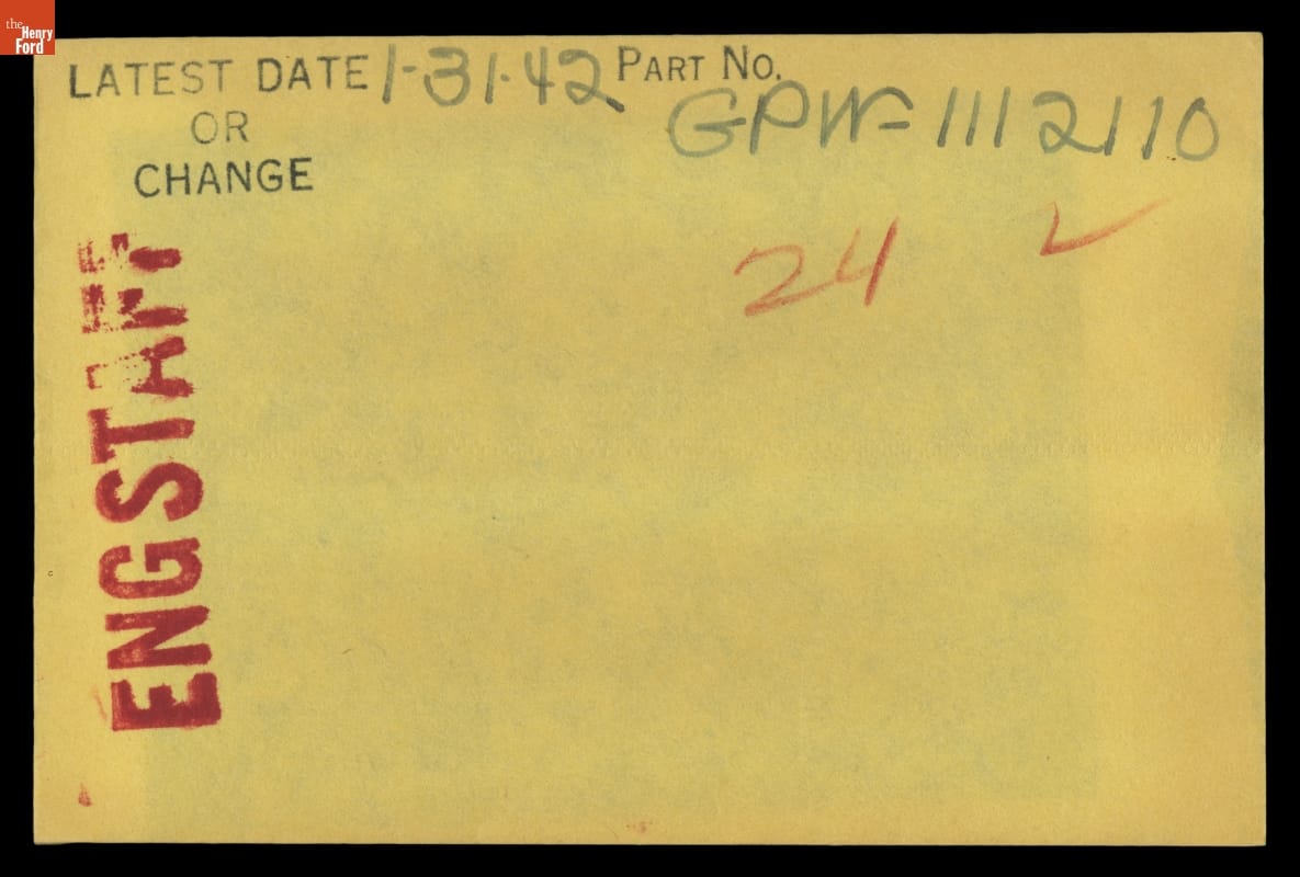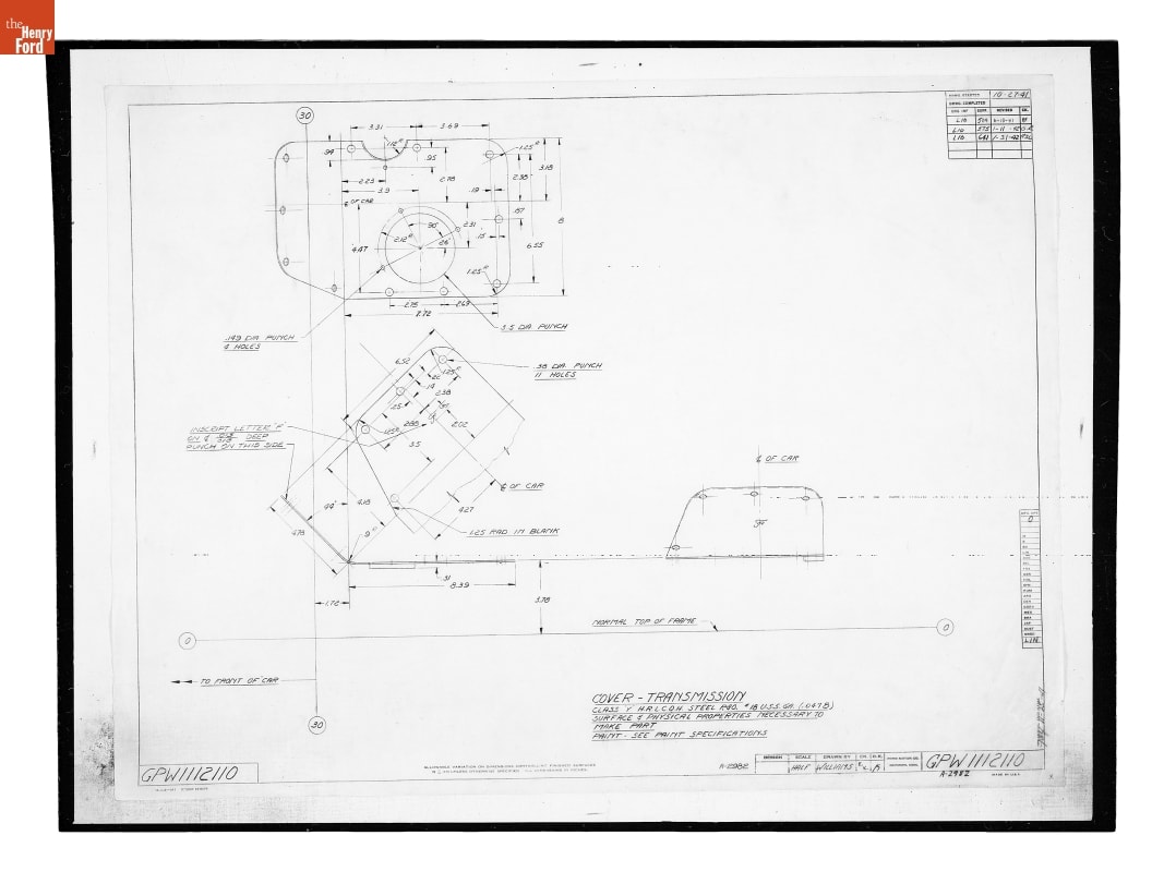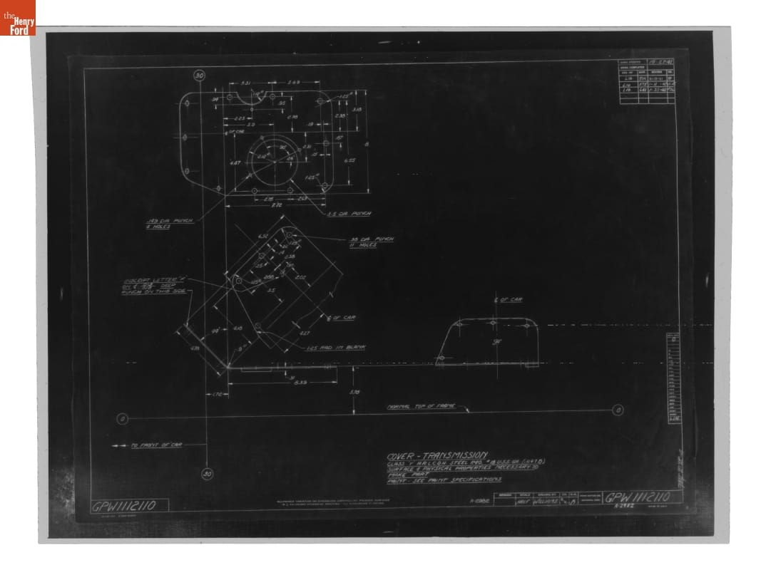 The Ford Motor Company created over a million parts drawings from 1903 to 1957. Many of these drawings specify engineering requirements for the components of Ford-made vehicles--including automobiles, trucks, tractors, military vehicles and Tri-motor airplanes. Others document assembly components, stages of casting and forging, or experimental designs. Beginning in the 1940s, Ford transferred the drawings to microfilm.