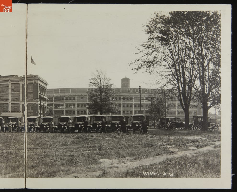 THF270339 / Red Cross Women Ambulance Drivers Outside Ford Motor Company Factory, July 1918 / panorama