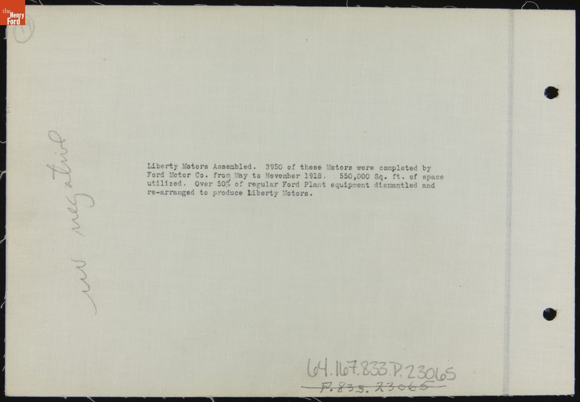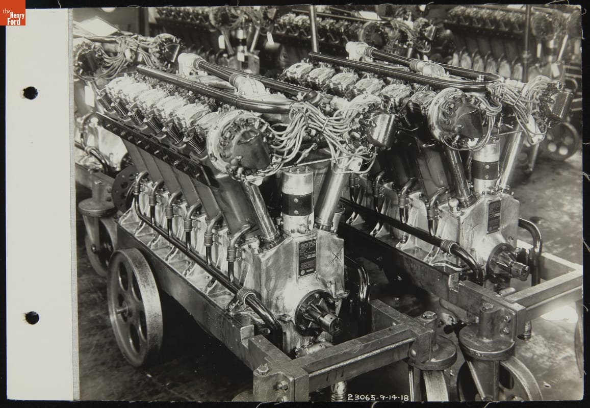 Designed at the urging of the United States government, the 400-horsepower Liberty V-12 engine powered military aircraft during World War I. Ford Motor Company manufactured 3,950 of these engines from May to November 1918. Lincoln, Marmon, Packard, Buick, and Cadillac also built Liberty engines during the war. Altogether, U.S. automakers produced more than 20,000 units.