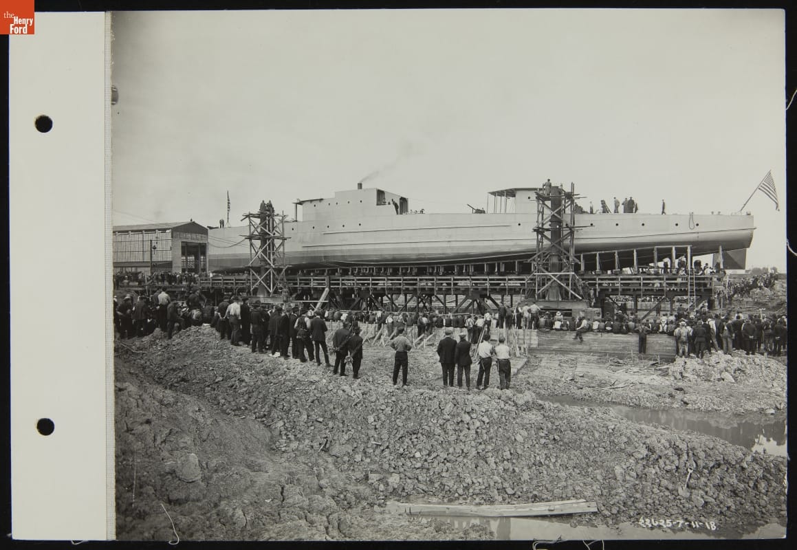 During the First World War, Ford built Eagle anti-submarine patrol boats at a new plant on the Rouge River. The company assembled the boats on massive flatcars that rolled through the factory. Ford launched Eagles into the river with a hydraulic steel trestle that lowered each hull into the water like a giant elevator. The process took about 40 minutes.