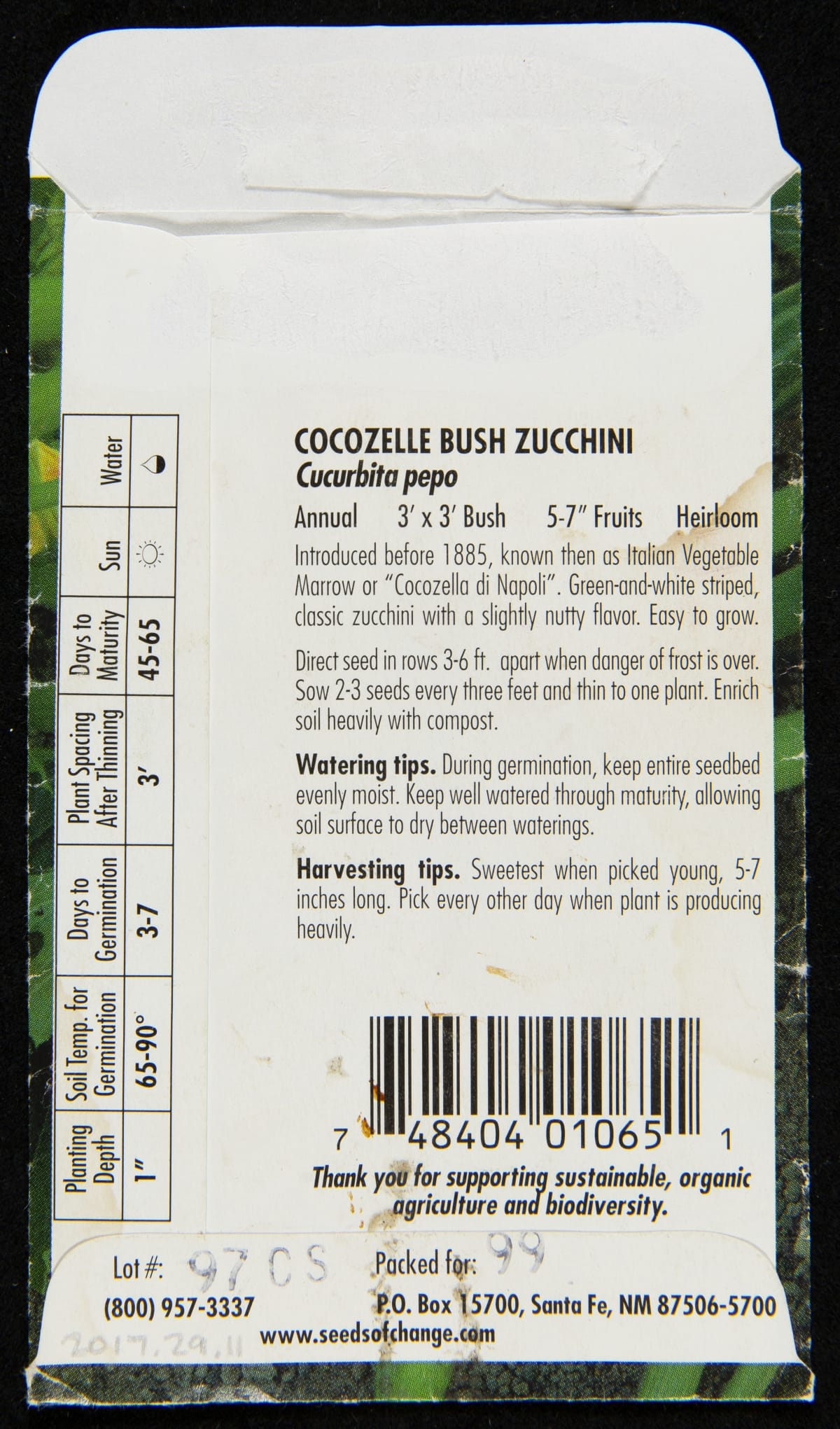Lot #: 97CS / Packed for: 99 / (800) 957-3337 / P.O. Box 15700, Santa Fe, NM 87506-5700 / www.seedsofchange.com