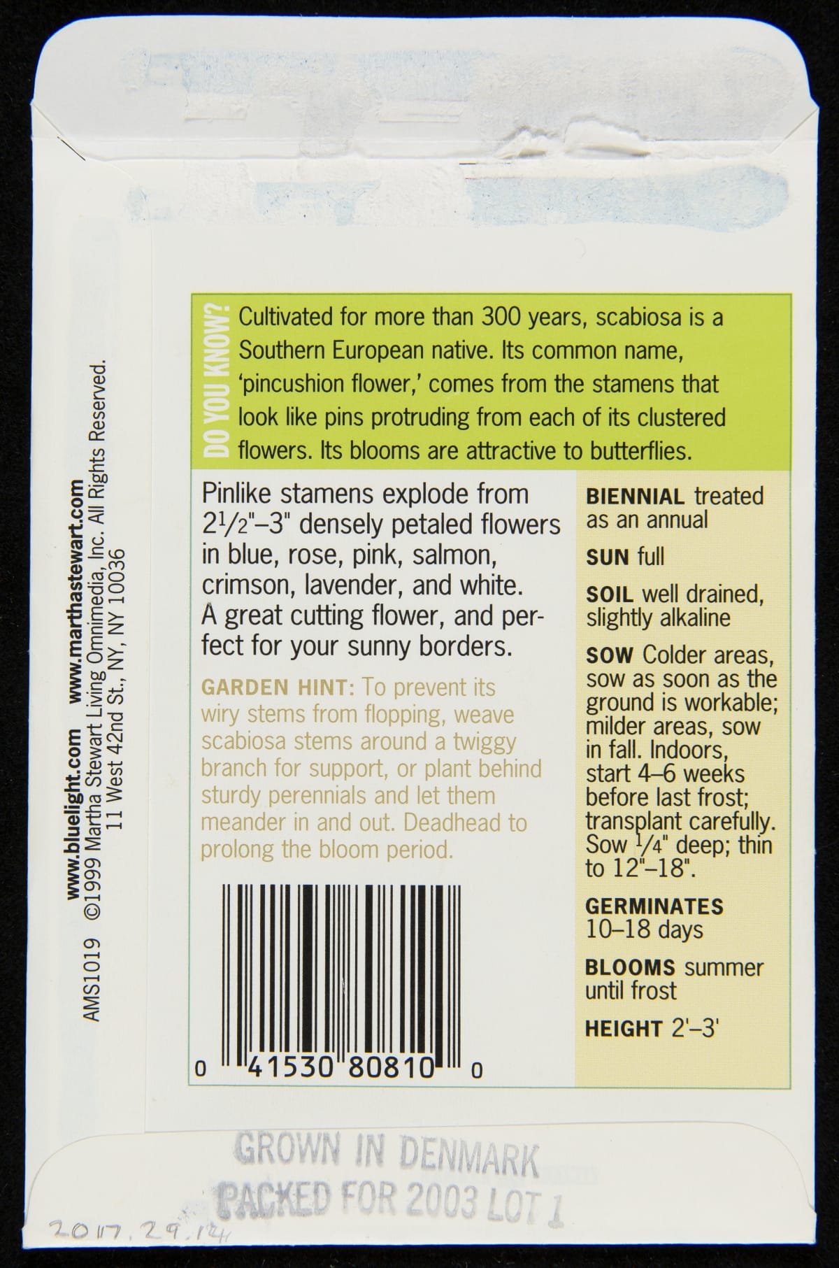 Martha Stewart "'Giant Imperial' Mix Scabiosa" Seed Packet, circa 2003