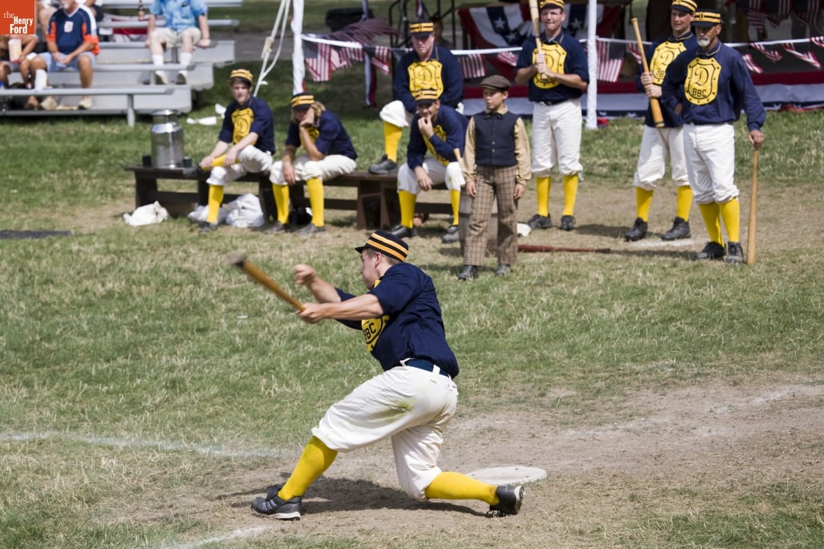 In August, baseball players from throughout the Midwest gather at Greenfield Village to participate in the World Tournament of Historic Base Ball. The games commemorate Detroit's 1867 World Base Ball Tournament, and players and umpires use period-inspired uniforms and equipment and follow the game's rule from the original tournament. This image shows one of the scenes from the tournament in 2007.
