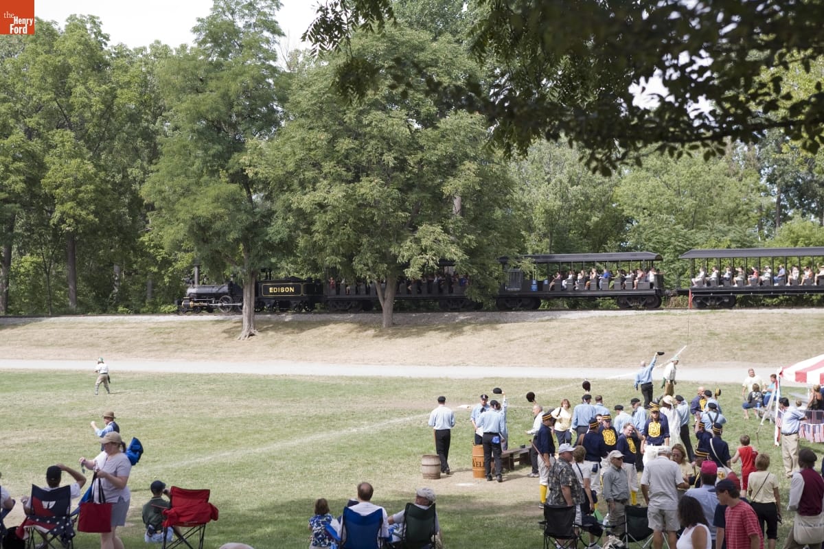 In August, baseball players from throughout the Midwest gather at Greenfield Village to participate in the World Tournament of Historic Base Ball. The games commemorate Detroit's 1867 World Base Ball Tournament, and players and umpires use period-inspired uniforms and equipment and follow the game's rule from the original tournament. This image shows one of the scenes from the tournament in 2007.