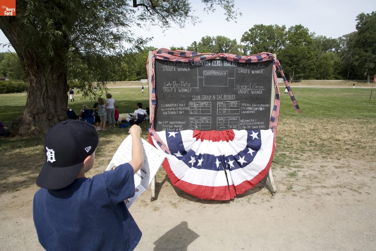 In August, baseball players from throughout the Midwest gather at Greenfield Village to participate in the World Tournament of Historic Base Ball. The games commemorate Detroit's 1867 World Base Ball Tournament, and players and umpires use period-inspired uniforms and equipment and follow the game's rule from the original tournament. This image shows one of the scenes from the tournament in 2007.