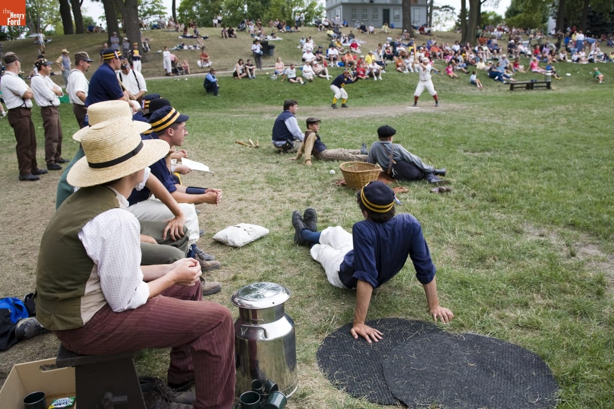 In August, baseball players from throughout the Midwest gather at Greenfield Village to participate in the World Tournament of Historic Base Ball. The games commemorate Detroit's 1867 World Base Ball Tournament, and players and umpires use period-inspired uniforms and equipment and follow the game's rule from the original tournament. This image shows one of the scenes from the tournament in 2007.