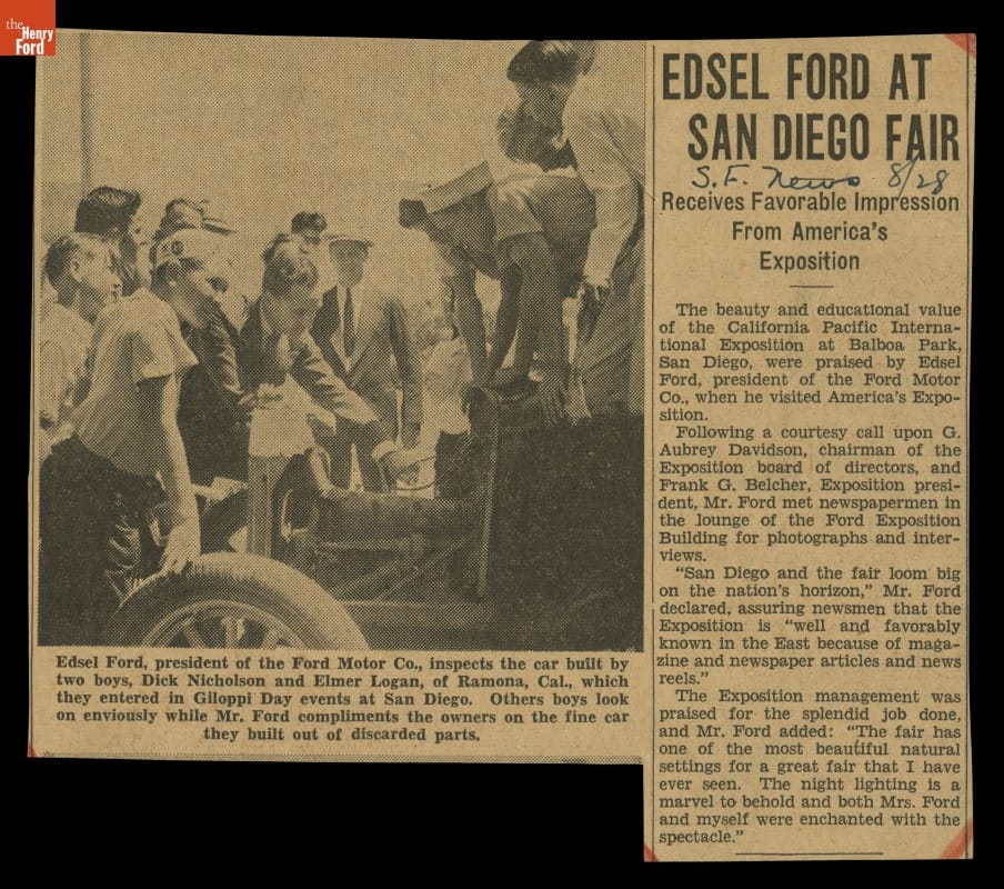 Newspaper Clipping, "Edsel Ford at San Diego Fair," San Francisco News, August 28, 1935