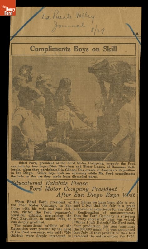 Take two mechanically inclined boys and a bunch of spare Ford parts and you may soon have a running automobile. Elmer Logan and Dick Nicholson built a vehicle for a "jalopy" contest at the 1935 California Pacific International Exposition in San Diego. Their entry may not have been pretty, but Edsel Ford was impressed with the boys' determination and ability.