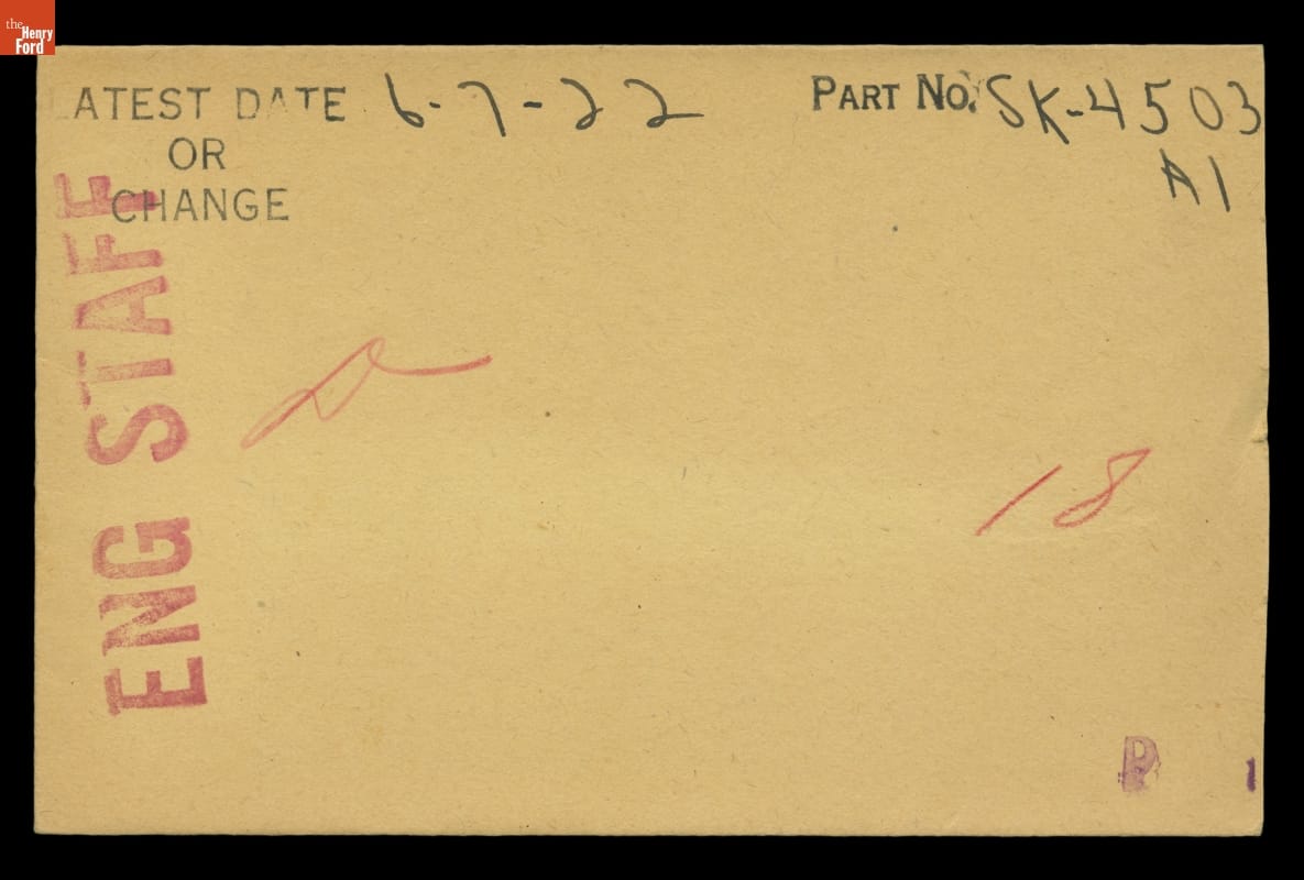 The Ford Motor Company created over a million parts drawings from 1903 to 1957. Many of these drawings specify engineering requirements for the components of Ford-made vehicles--including automobiles, trucks, tractors, military vehicles and Tri-motor airplanes. Others document assembly components, stages of casting and forging, or experimental designs. Beginning in the 1940s, Ford transferred the drawings to microfilm.
