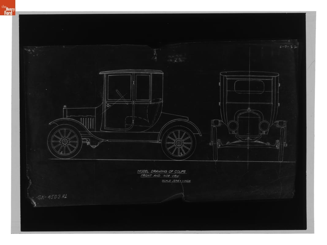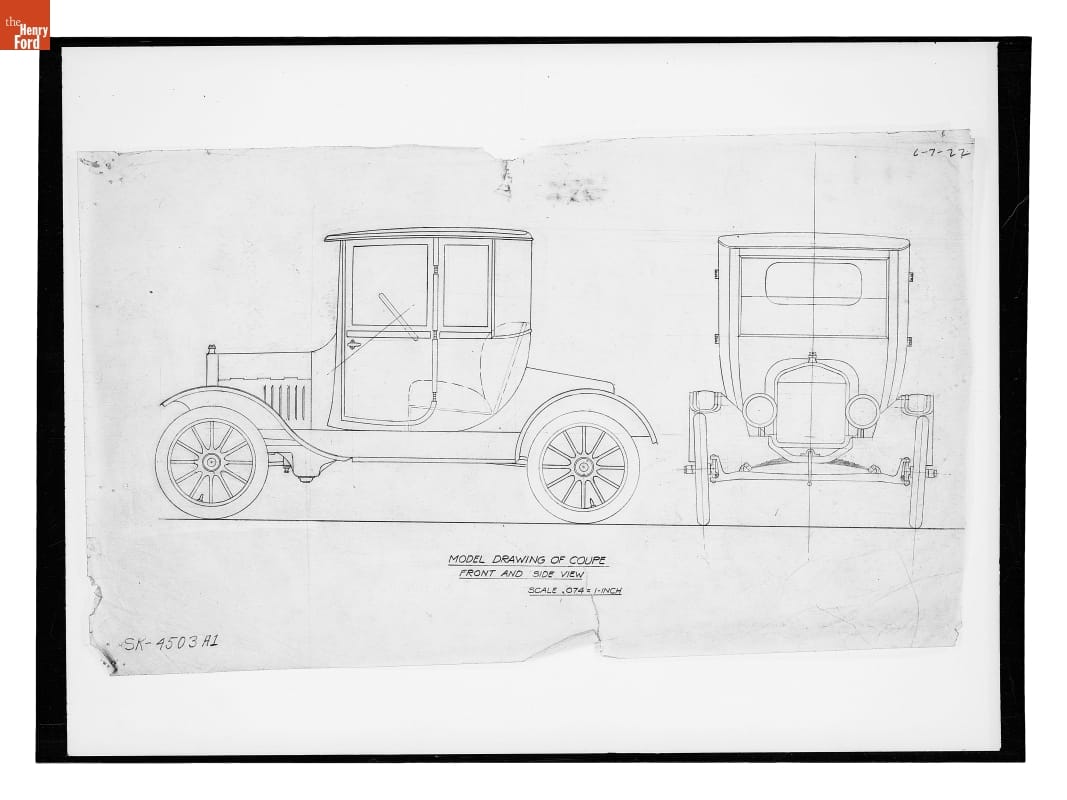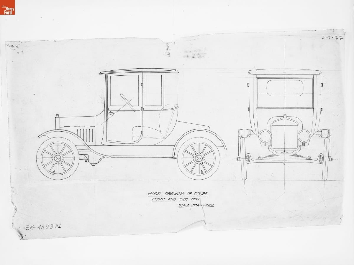 Drawing, "Model Drawing of Coupe, Front and Side View," Ford Model T, June 7, 1922