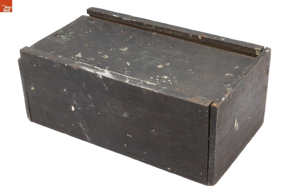 Box made by Thomas Clarkson Gordon, Spiceland, Indiana. Oil paints in box made by The Oxford Oil Co., the American Crayon Company, and in Dusseldorf, Germany.