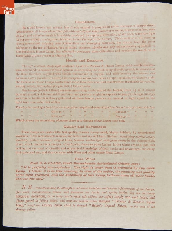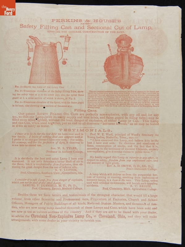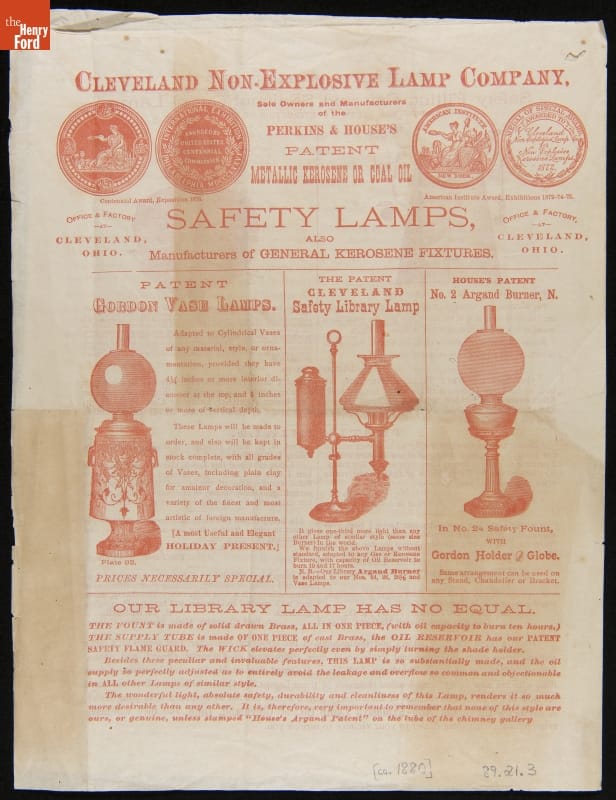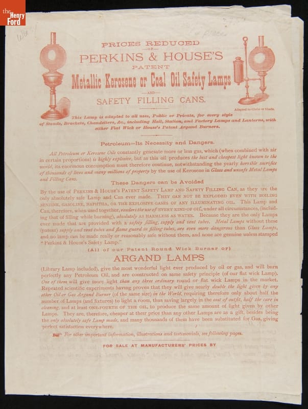 "Prices Reduced of Perkins & House's Patent Metallic Kerosene or Coal Oil Safety Lamps and Safety Filling Cans," circa 1880