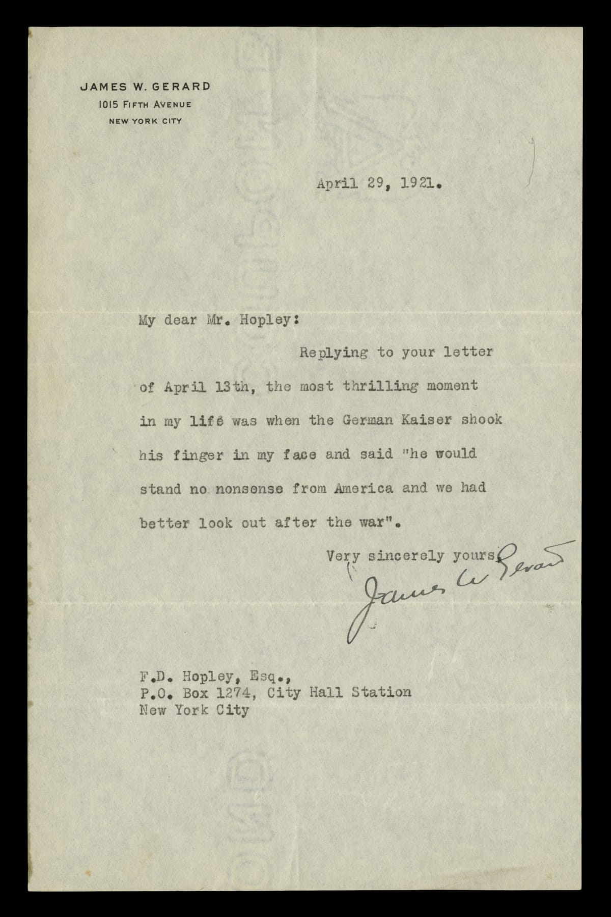 Letter from James W. Gerard to Frank Hopley, April 29, 1921, "The Most Thrilling Moment of My Life"