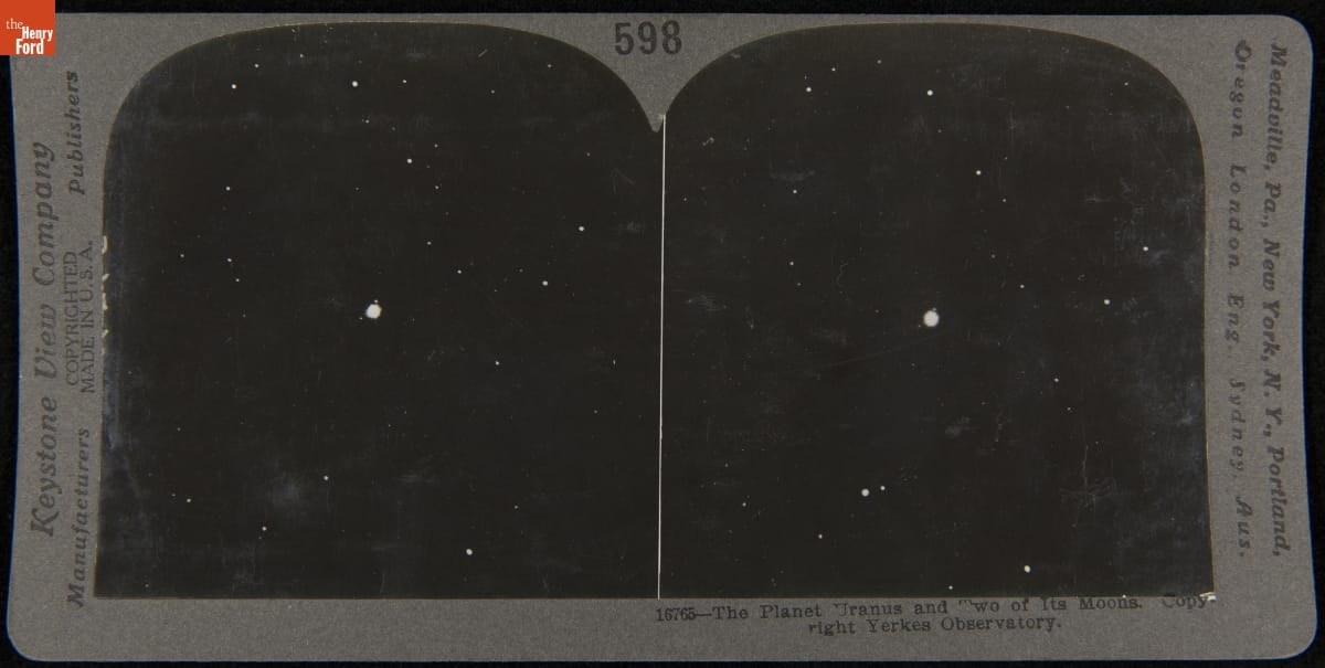 Americans loved stereographs -- millions were made from the mid-1800s through the 1930s. A stereograph consists of two offset photos that appear to have three-dimensional depth when viewed through a stereoscope. These images entertained and educated. Stereographs could transport viewers to distant events, exotic places, and even worlds beyond, like this view of Uranus and two of its moons.