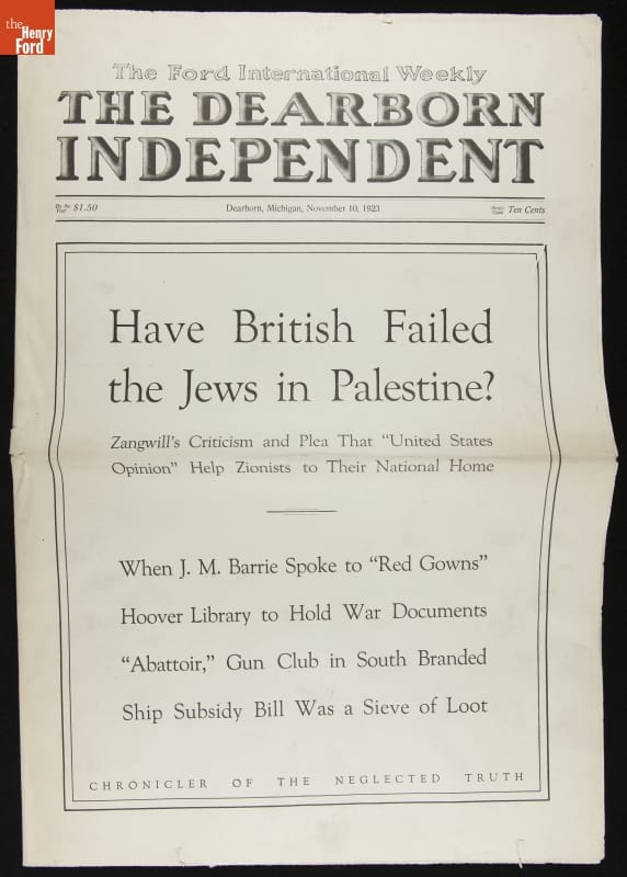 Henry Ford purchased The Dearborn Independent and published it under his name from 1919 to 1927. It served as a forum for Ford's views, free from other media outlets that had attacked his work and values and were outside his control. The Dearborn Independent covered world events, business and economic news, and fiction from noted authors. Sadly, it also served as an outlet for Ford's anti-Semitic sentiments. Between 1920 and 1922, the weekly paper ran a series of front-page articles that denounced all things Jewish. Even after this series, many articles contained anti-Jewish language. Though Ford later apologized and printed a retraction, these notoriously anti-Semitic editorials and articles forever tarnished the influential automaker's reputation.