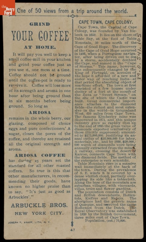Trade Card for Ariosa Coffee, Arbuckle Bros., "Cape Town, Cape Colony," 1891