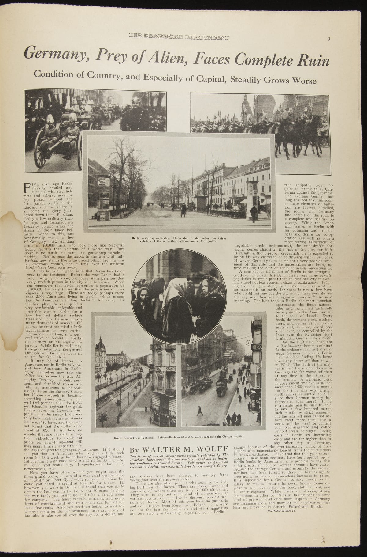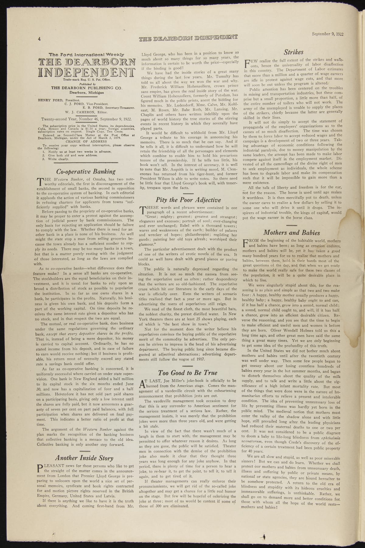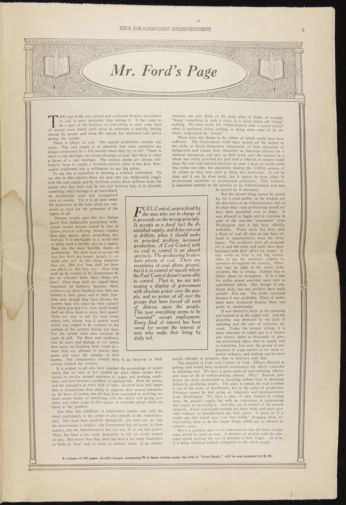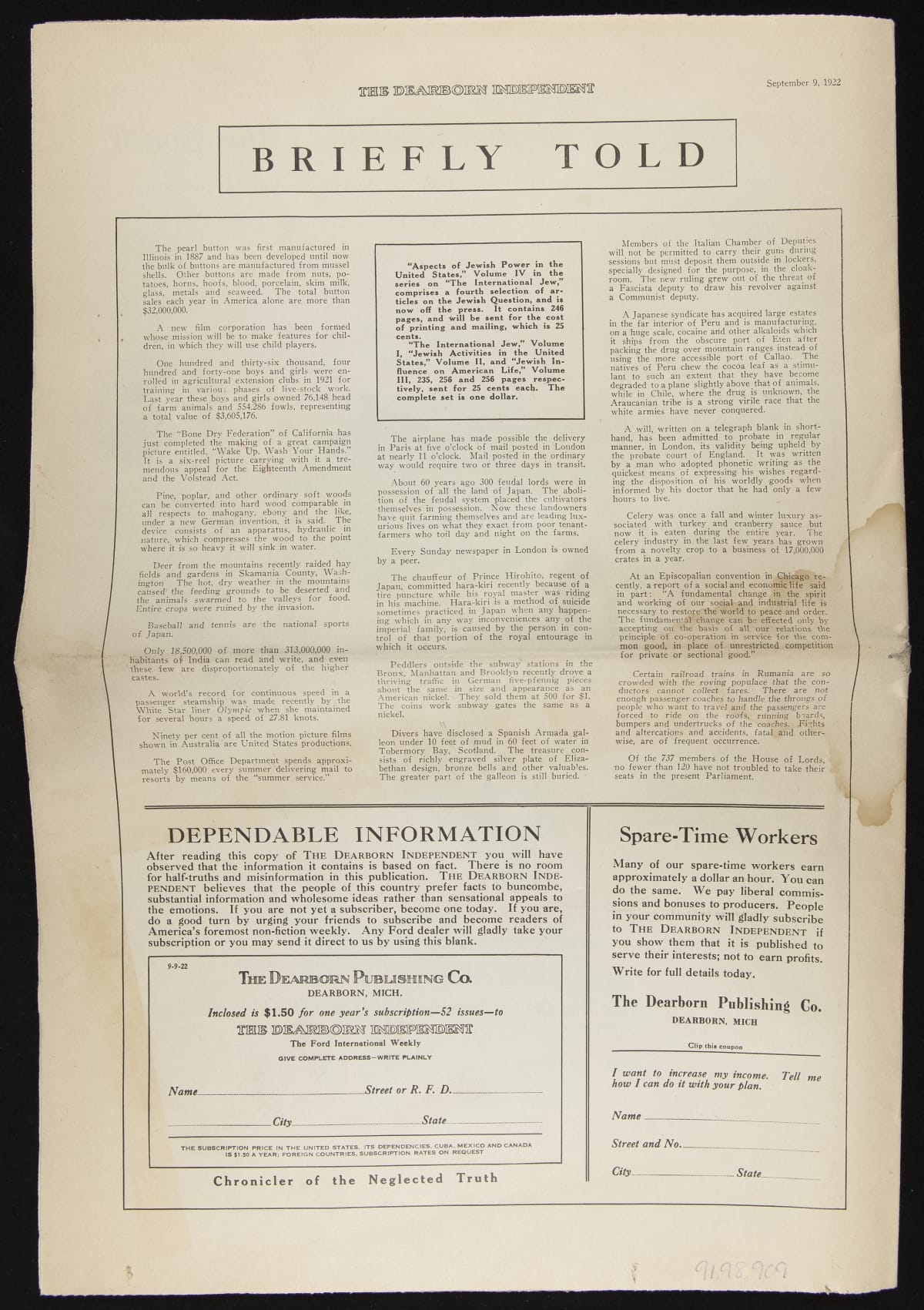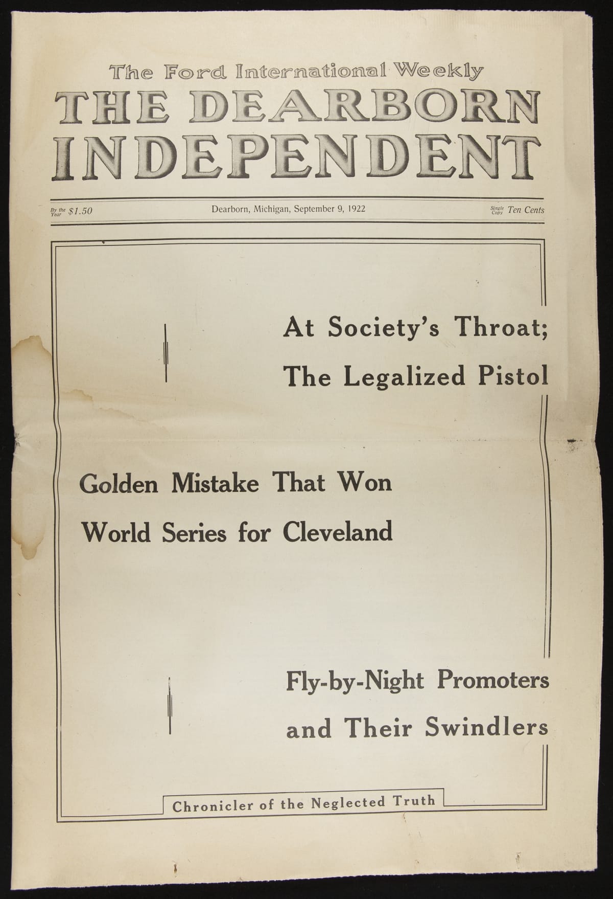 Henry Ford purchased The Dearborn Independent and published it under his name from 1919 to 1927. It served as a forum for Ford's views, free from other media outlets that had attacked his work and values and were outside his control. The Dearborn Independent covered world events, business and economic news, and fiction from noted authors. Sadly, it also served as an outlet for Ford's anti-Semitic sentiments. Between 1920 and 1922, the weekly paper ran a series of front-page articles that denounced all things Jewish. Even after this series, many articles contained anti-Jewish language. Though Ford later apologized and printed a retraction, these notoriously anti-Semitic editorials and articles forever tarnished the influential automaker's reputation.