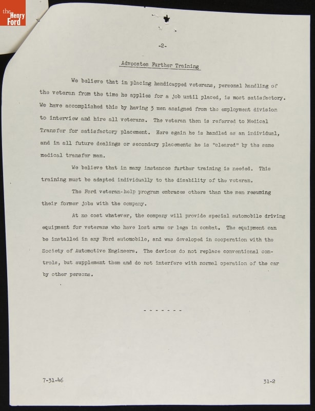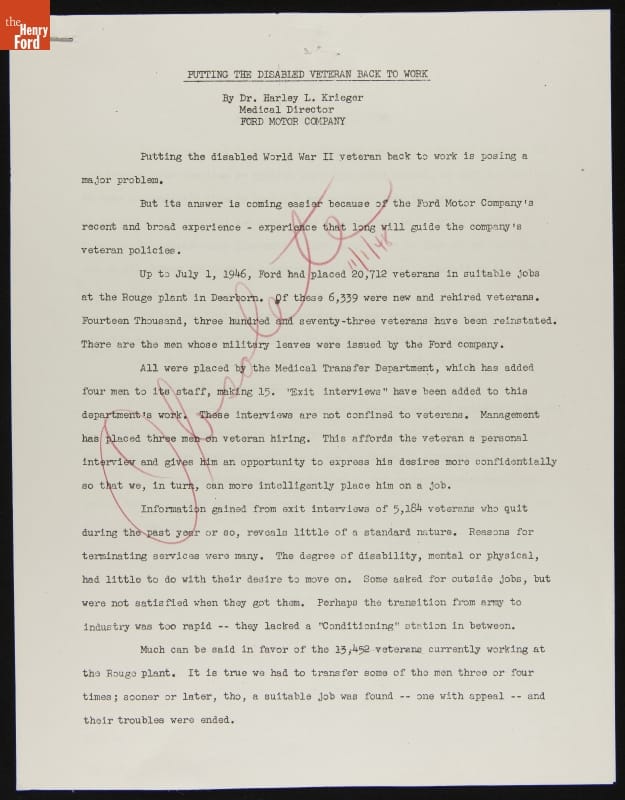 "Putting the Disabled Veteran Back to Work," Ford Press Release by Harley L. Krieger, July 31, 1946